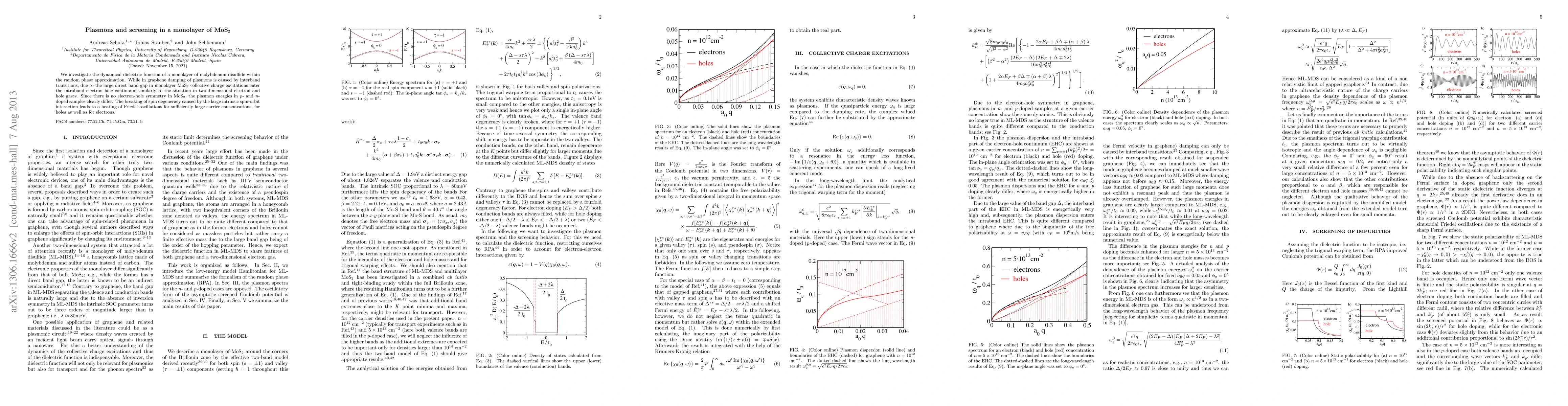 We investigate the dynamical dielectric function of a monolayer of molybdenum disulfide within the random phase approximation. While in graphene damping of plasmons is caused by interband transitions, due to the large direct band gap in monolayer MoS$_2$ collective charge excitations enter the intraband electron hole continuum similar to the situation in two-dimensional electron and hole gases. Since there is no electron-hole symmetry in MoS$_2$, the plasmon energies in p- and n-doped samples clearly differ. The breaking of spin degeneracy caused by the large intrinsic spin-orbit interaction leads to a beating of Friedel oscillations for sufficiently large carrier concentrations, for holes as well as for electrons.