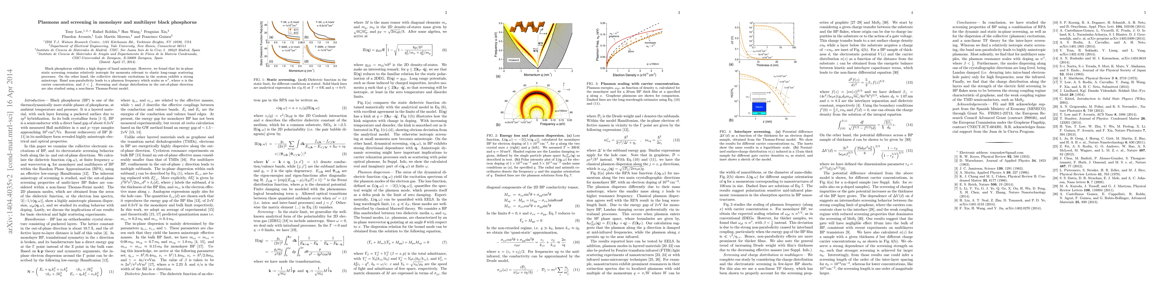 This paper investigates the screening and plasmon behavior in black phosphorus, finding that while its in-plane static screening is isotropic, the collective electronic excitations show strong anisotropy. The study also reveals a non-parabolic scaling of plasmon frequency with carrier concentration and examines out-of-plane screening using a non-linear Thomas-Fermi model.
