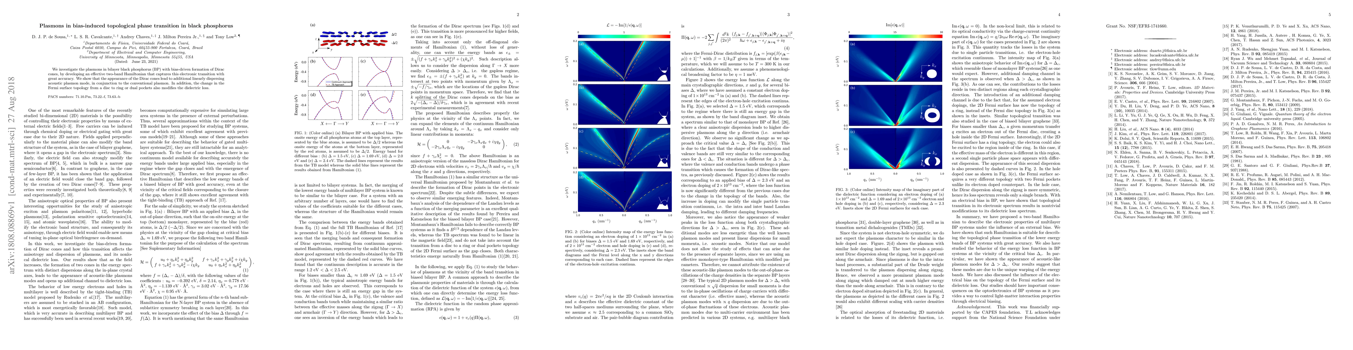 This paper explores the plasmons in bilayer black phosphorus undergoing a topological phase transition due to bias. The study reveals an additional linearly dispersing acoustic plasmon mode alongside the conventional plasmon, resulting from the formation of Dirac cones and changes in the Fermi surface topology.