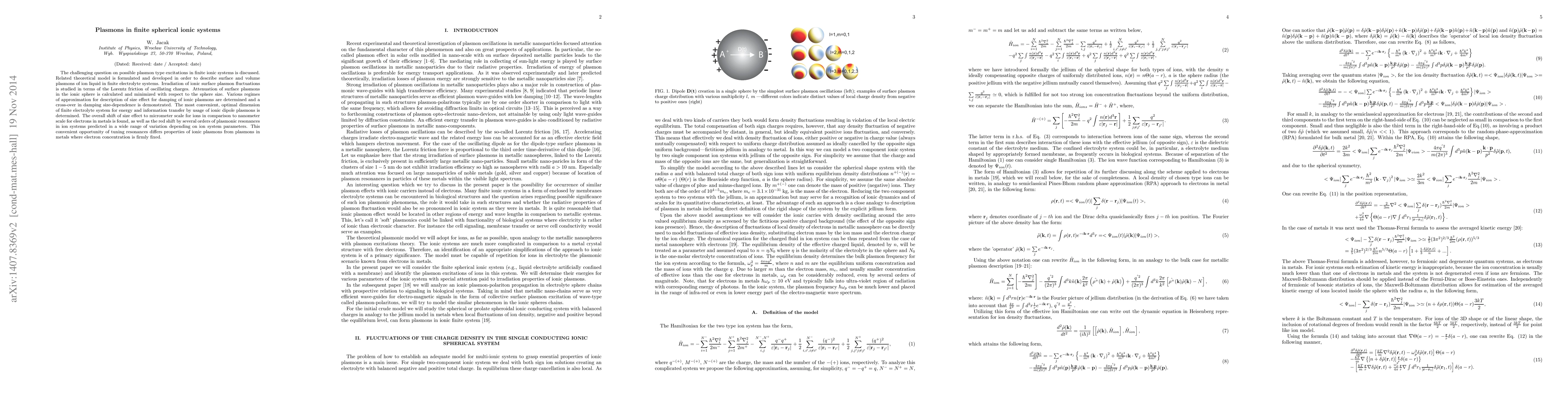 The challenging question on possible plasmon type excitations in finite ionic systems is discussed. The related theoretical model is formulated and developed in order to describe surface and volume plasmons of ion liquid in finite electrolyte systems. The irradiation of ionic surface plasmon fluctuations is studied in terms of the Lorentz friction of oscillating charges. The attenuation of surface plasmons in the ionic sphere is calculated and minimized with respect to the sphere size. Various regimes of approximation for description of size effect for damping of ionic plasmons are determined and a cross-over in damping size-dependence is demonstrated. The most convenient dimension of finite electrolyte system for energy and information transfer by usage of ionic dipole plasmons is determined. The overall shift of size effect to micrometer scale for ions in comparison to nanometer scale for electrons in metals is found and by several orders red shift of plasmonic resonances in ion systems is predicted in a wide range of variation depending of ion system parameters. This convenient opportunity of tuning of resonances differs ionic plasmons from plasmons in metals where electron concentration was firmly fixed.