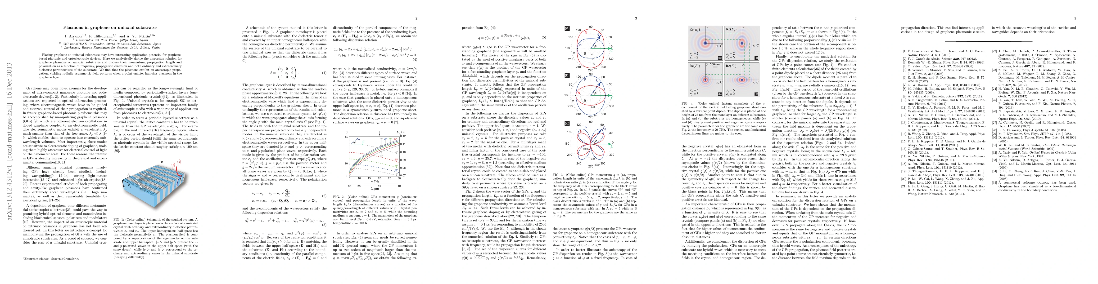 This paper analytically derives the dispersion relation for graphene plasmons on uniaxial substrates, exploring their anisotropic propagation, momentum, and polarization. The study reveals radially asymmetric field patterns due to the unique properties of graphene on such substrates, suggesting potential for advanced photonic and optoelectronic devices.
