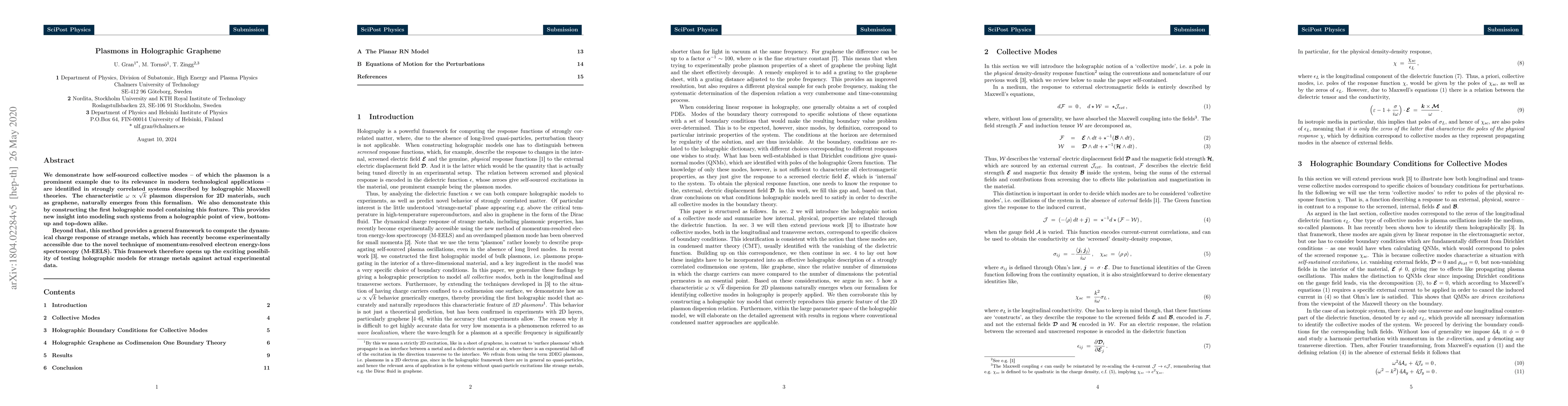 We demonstrate how self-sourced collective modes - of which the plasmon is a prominent example due to its relevance in modern technological applications - are identified in strongly correlated systems described by holographic Maxwell theories. The characteristic $\omega \propto \sqrt{k}$ plasmon dispersion for 2D materials, such as graphene, naturally emerges from this formalism. We also demonstrate this by constructing the first holographic model containing this feature. This provides new insight into modeling such systems from a holographic point of view, bottom-up and top-down alike. Beyond that, this method provides a general framework to compute the dynamical charge response of strange metals, which has recently become experimentally accessible due to the novel technique of momentum-resolved electron energy-loss spectroscopy (M-EELS). This framework therefore opens up the exciting possibility of testing holographic models for strange metals against actual experimental data.