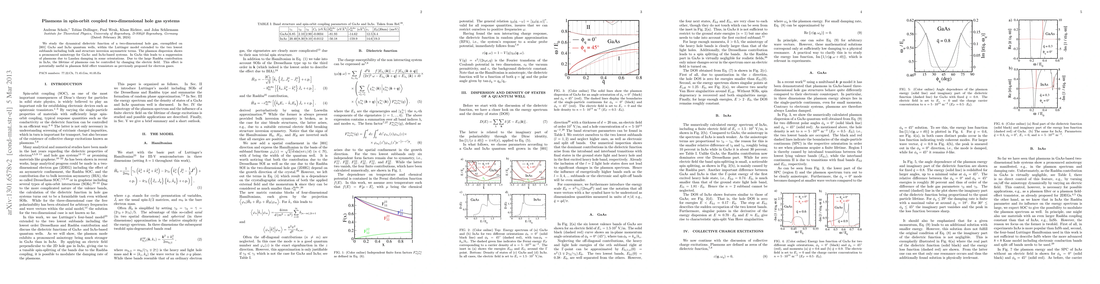 We study the dynamical dielectric function of a two-dimensional hole gas, exemplified on [001]-GaAs and InAs quantum wells, within the Luttinger model extended to the two lowest subbands including bulk and structure inversion asymmetric terms. The plasmon dispersion shows a pronounced anisotropy for GaAs- and InAs-based systems. In GaAs this leads to a suppression of plasmons due to Landau damping in some orientations. Due to the large Rashba contribution in InAs, the lifetime of plasmons can be controlled by changing the electric field. This effect is potentially useful in plasmon field effect transistors as previously proposed for electron gases.