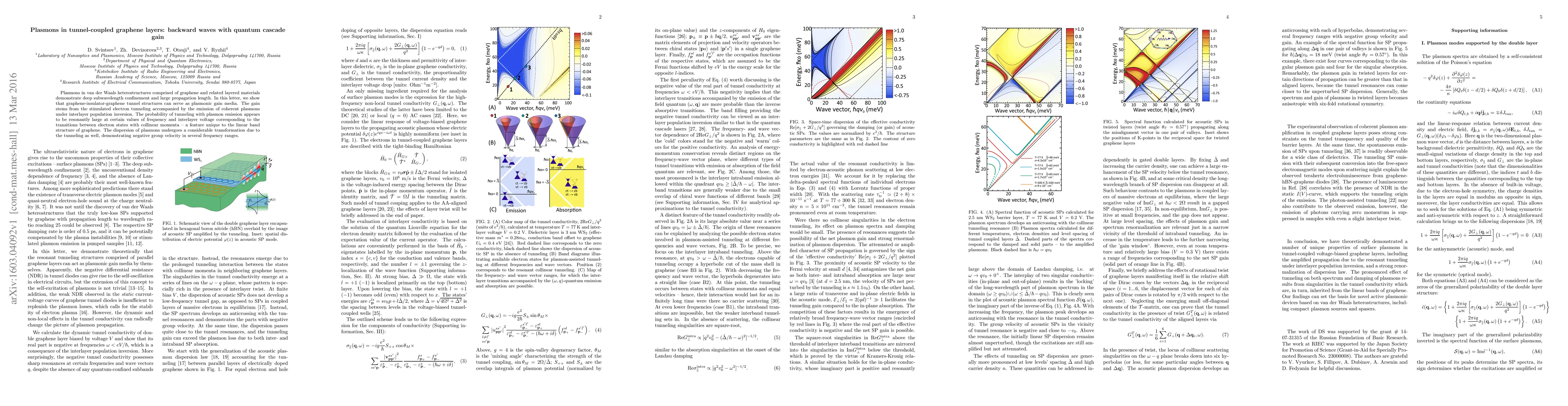This paper investigates the plasmonic behavior in tunnel-coupled graphene layers, revealing deep subwavelength confinement and long propagation length. It demonstrates that graphene-insulator-graphene structures can act as gain media through stimulated electron tunneling, resulting in coherent plasmon emission and backward wave propagation with quantum cascade gain.