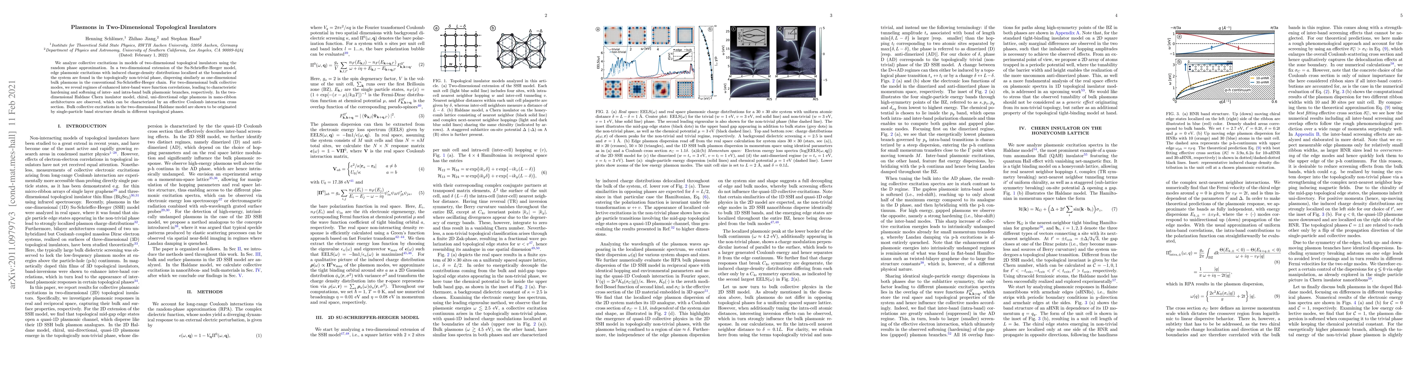 This paper investigates collective excitations in two-dimensional topological insulators, identifying edge plasmons localized at boundaries and bulk plasmons with varying hardening and softening in different models, including the Su-Schrieffer-Heeger and Haldane Chern insulator frameworks.