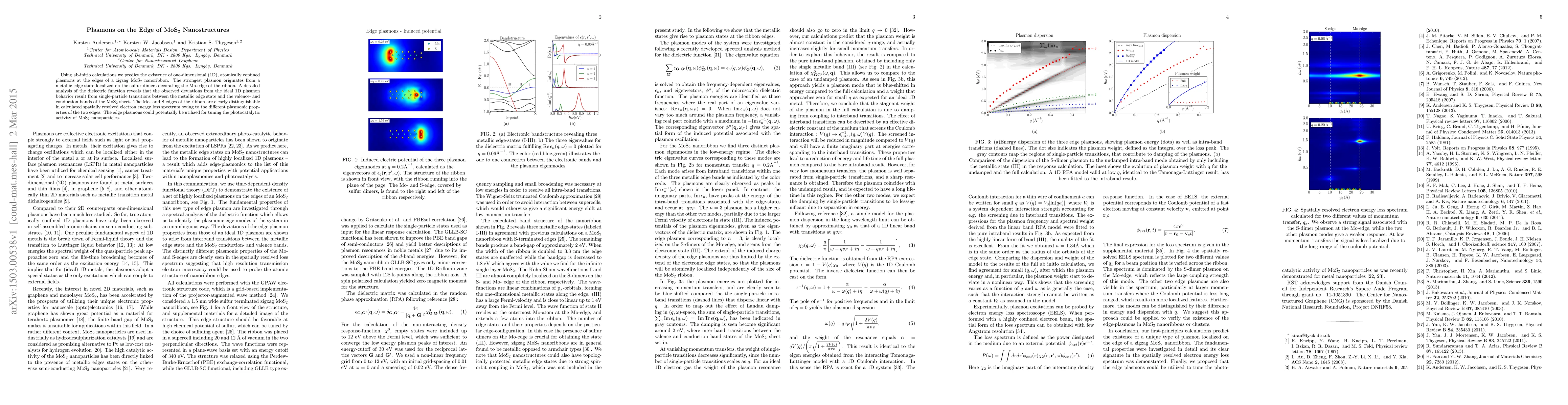 Using ab initio calculations we predict the existence of one-dimensional (1D), atomically confined plasmons at the edges of a zigzag MoS2 nanoribbon. The strongest plasmon originates from a metallic edge state localized on the sulfur dimers decorating the Mo edge of the ribbon. A detailed analysis of the dielectric function reveals that the observed deviations from the ideal 1D plasmon behavior result from single-particle transitions between the metallic edge state and the valence and conduction bands of the MoS2 sheet. The Mo and S edges of the ribbon are clearly distinguishable in calculated spatially resolved electron energy loss spectrum owing to the different plasmonic properties of the two edges. The edge plasmons could potentially be utilized for tuning the photocatalytic activity of MoS2 nanoparticles.