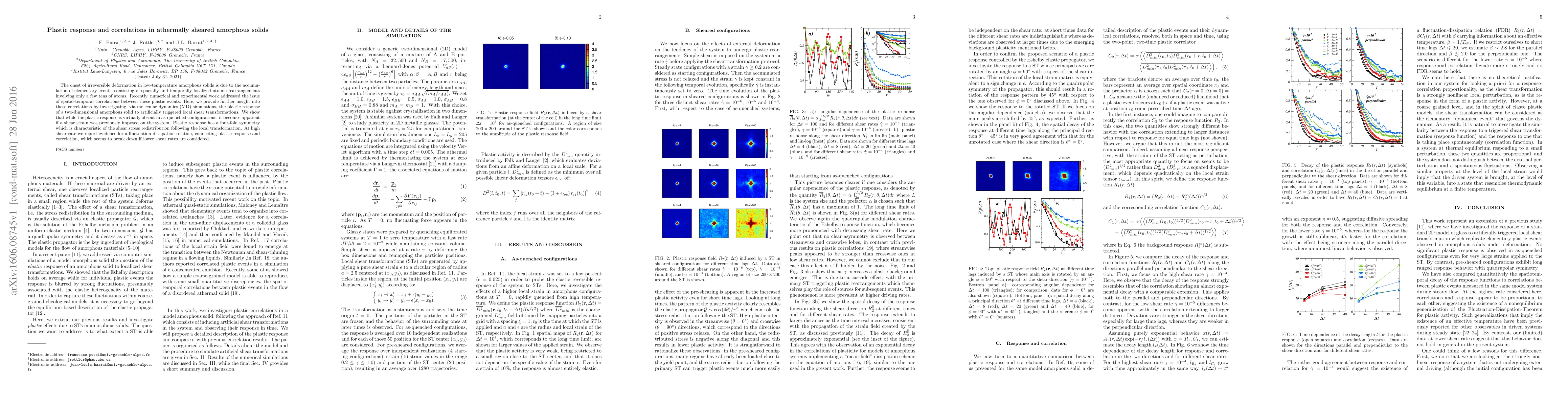 This paper investigates the plastic response and spatio-temporal correlations in athermally sheared two-dimensional amorphous solids using molecular dynamics simulations. The study reveals that plastic deformation emerges and exhibits a four-fold symmetry when local shear transformations are imposed, and a fluctuation-dissipation relation is observed at high shear rates, which breaks down at lower rates.