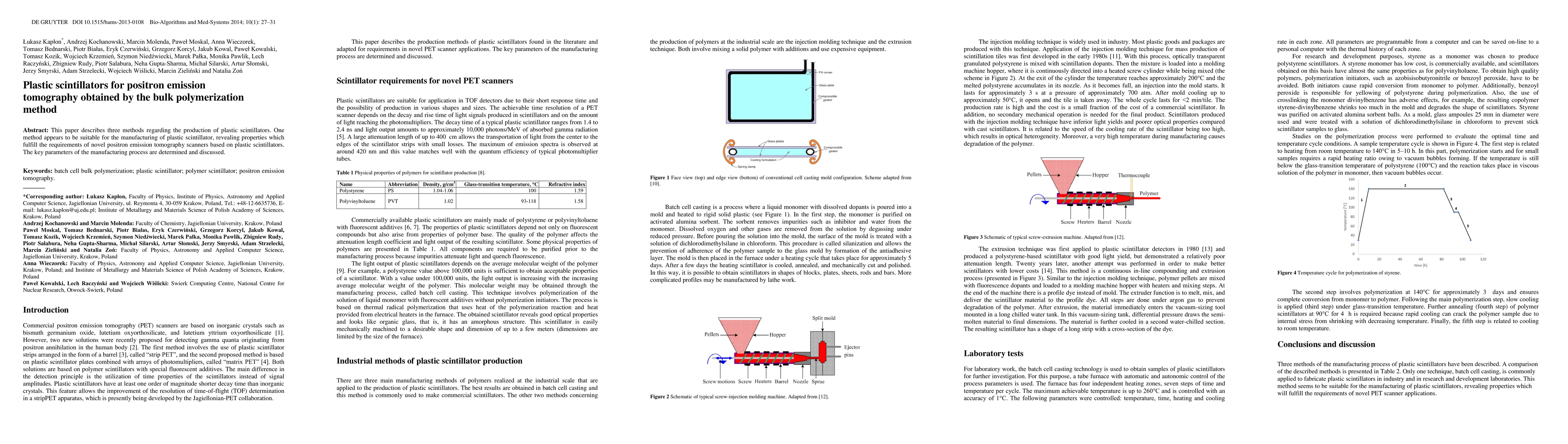 This paper explores three methods for producing plastic scintillators, with one method demonstrating optimal properties for novel positron emission tomography scanners. Key parameters of the effective manufacturing process are identified and analyzed.