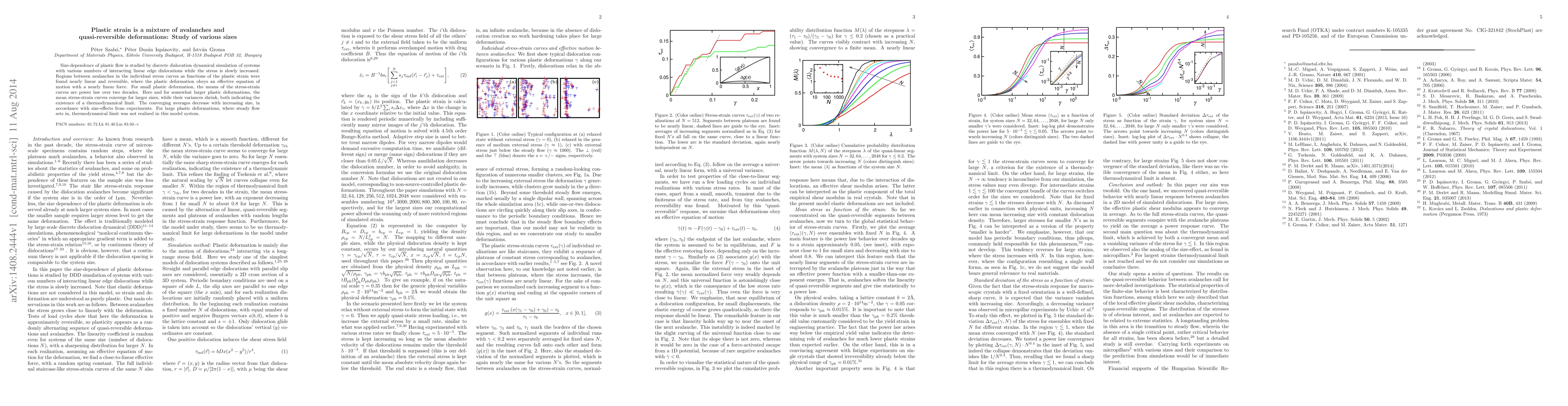 This study uses discrete dislocation dynamics simulations to explore the size-dependent plastic flow of materials, revealing that plastic deformation comprises both avalanches and quasi-reversible regions. The research shows that for small deformations, stress-strain curves exhibit power law behavior, while larger sizes lead to convergence of mean curves, indicating a thermodynamical limit.