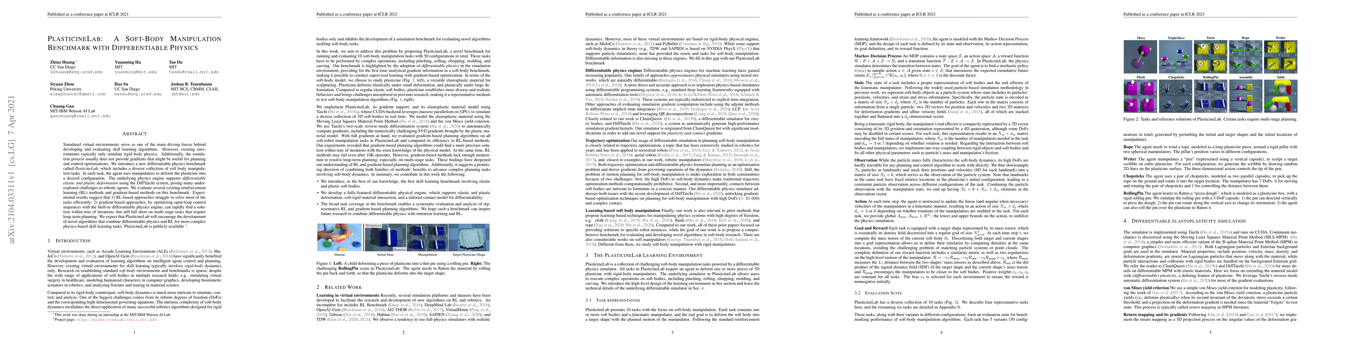 PlasticineLab is a novel differentiable physics benchmark featuring diverse soft body manipulation tasks. Gradient-based methods outperform reinforcement learning in solving these tasks, highlighting the need for combining differentiable physics with reinforcement learning for complex skill learning.