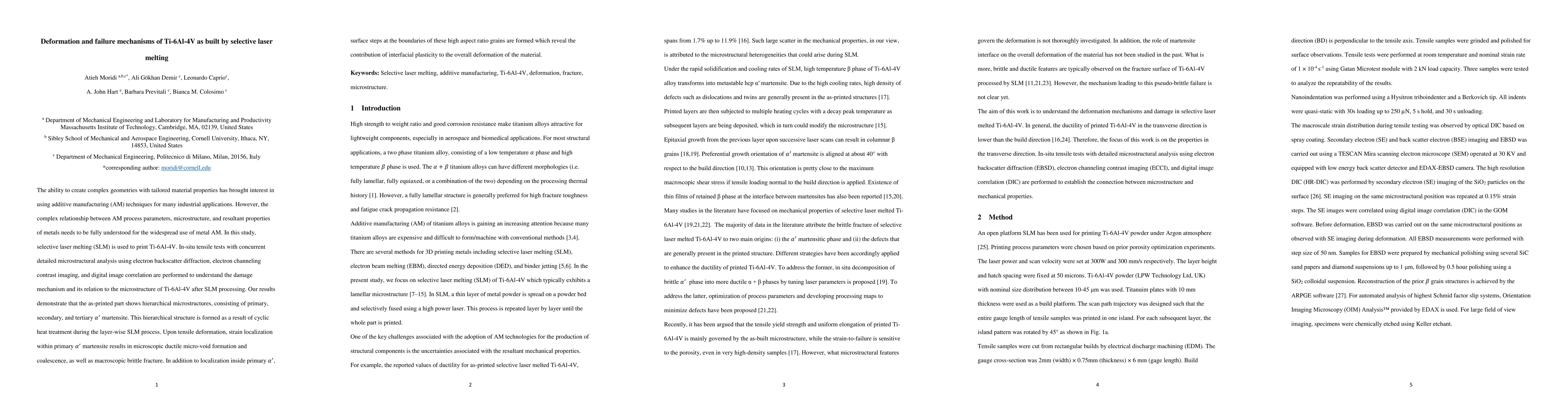 This study investigates the damage mechanisms in Ti-6Al-4V produced via selective laser melting, revealing a hierarchical microstructure of martensite phases. In-situ tensile tests show that strain localization in primary martensite leads to ductile micro-void formation and macroscopic brittle fracture, with interfacial plasticity contributing to the material's deformation.