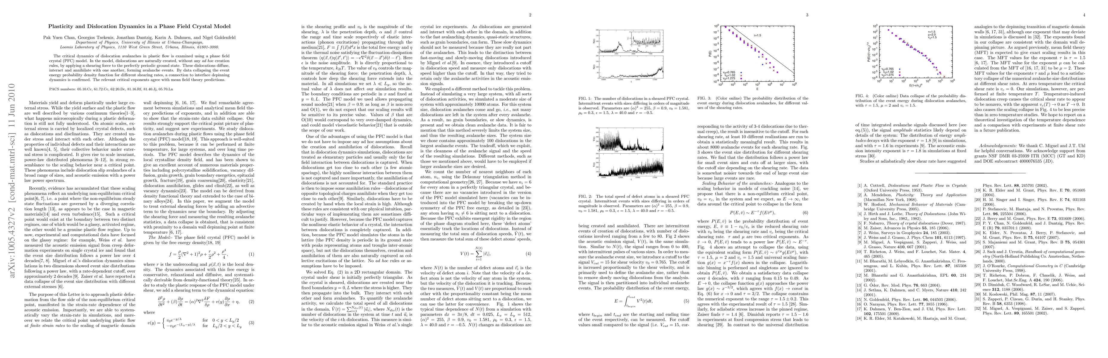 This paper investigates dislocation dynamics in plastic flow using a phase field crystal model, showing that dislocations naturally form and interact, leading to avalanche events. The study confirms a connection to interface depinning dynamics and finds critical exponents consistent with mean field theory predictions.