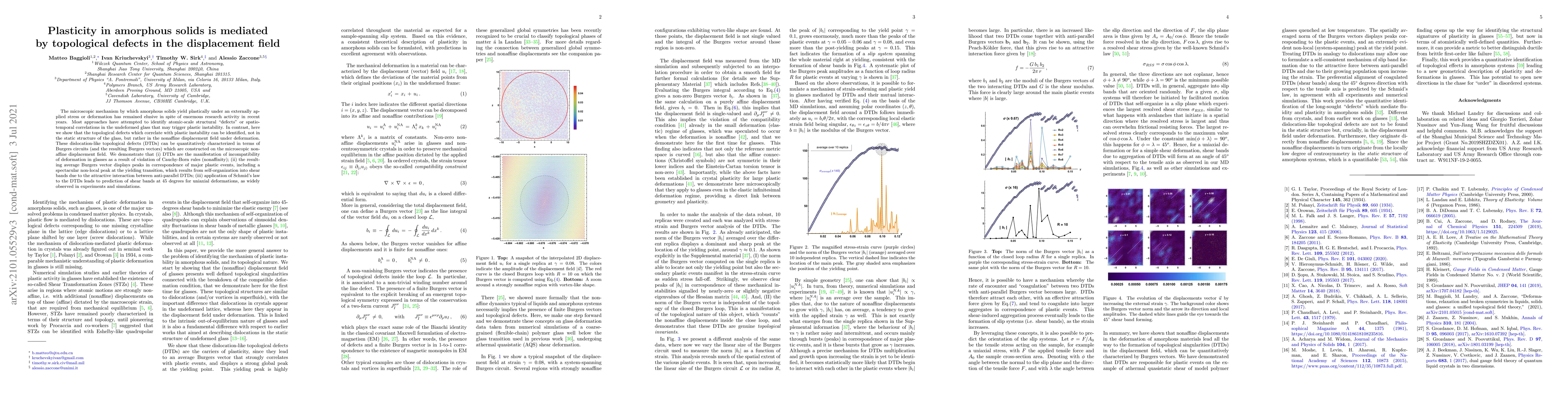 The microscopic mechanism by which amorphous solids yield plastically under an externally applied stress or deformation has remained elusive in spite of enormous research activity in recent years. Most approaches have attempted to identify atomic-scale structural "defects" or spatio-temporal correlations in the undeformed glass that may trigger plastic instability. In contrast, here we show that the topological defects which correlate with plastic instability can be identified, not in the static structure of the glass, but rather in the nonaffine displacement field under deformation. These dislocation-like topological defects (DTDs) can be quantitatively characterized in terms of Burgers circuits (and the resulting Burgers vectors) which are constructed on the microscopic nonaffine displacement field. We demonstrate that (i) DTDs are the manifestation of incompatibility of deformation in glasses as a result of violation of Cauchy-Born rules (nonaffinity); (ii) the resulting average Burgers vector displays peaks in correspondence of major plastic events, including a spectacular non-local peak at the yielding transition, which results from self-organization into shear bands due to the attractive interaction between anti-parallel DTDs; (iii) application of Schmid's law to the DTDs leads to prediction of shear bands at 45 degrees for uniaxial deformations, as widely observed in experiments and simulations.