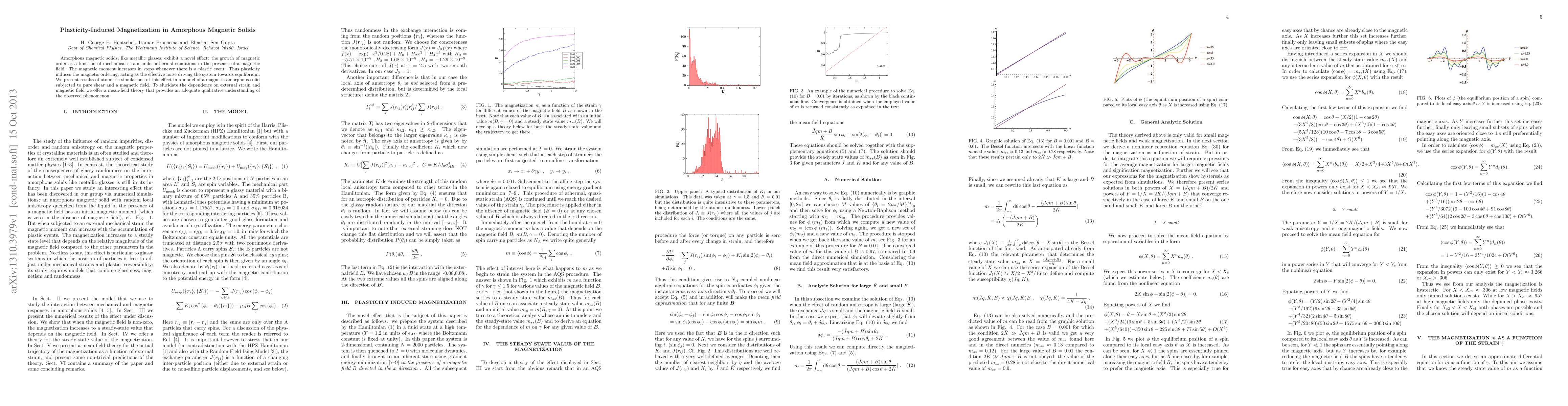 This paper explores how mechanical strain induces magnetic ordering in amorphous magnetic solids, showing that plastic deformations cause stepwise increases in magnetic moment. Atomistic simulations and a mean-field theory elucidate the effects of external strain and magnetic fields on this phenomenon.