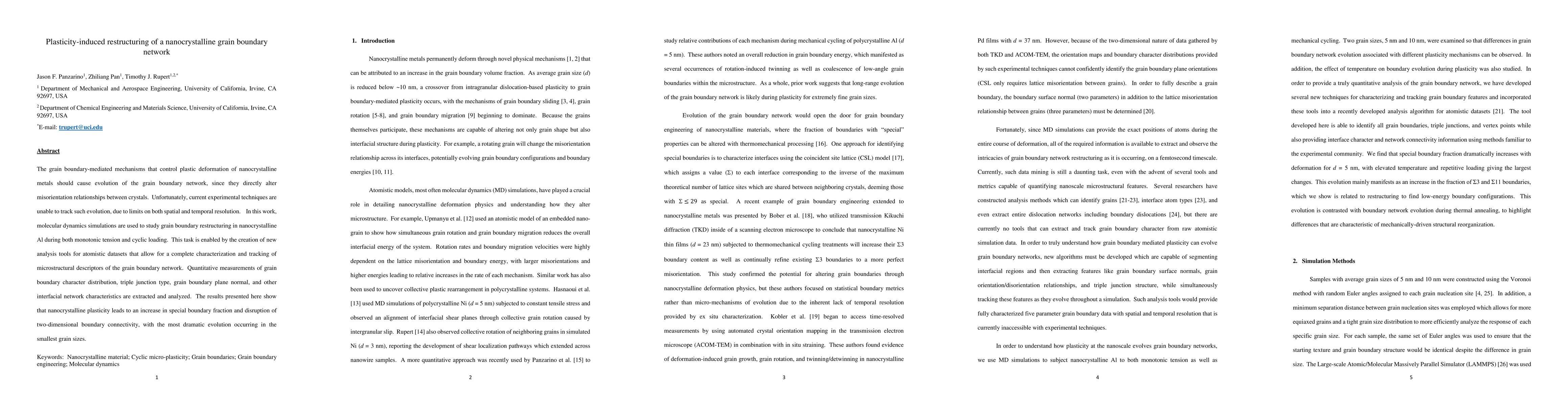 This study uses molecular dynamics simulations to investigate the evolution of grain boundary networks in nanocrystalline aluminum under tension and cyclic loading. New analysis tools enable detailed tracking of microstructural descriptors, revealing that plasticity increases special boundary fractions and disrupts boundary connectivity, especially in smaller grains.
