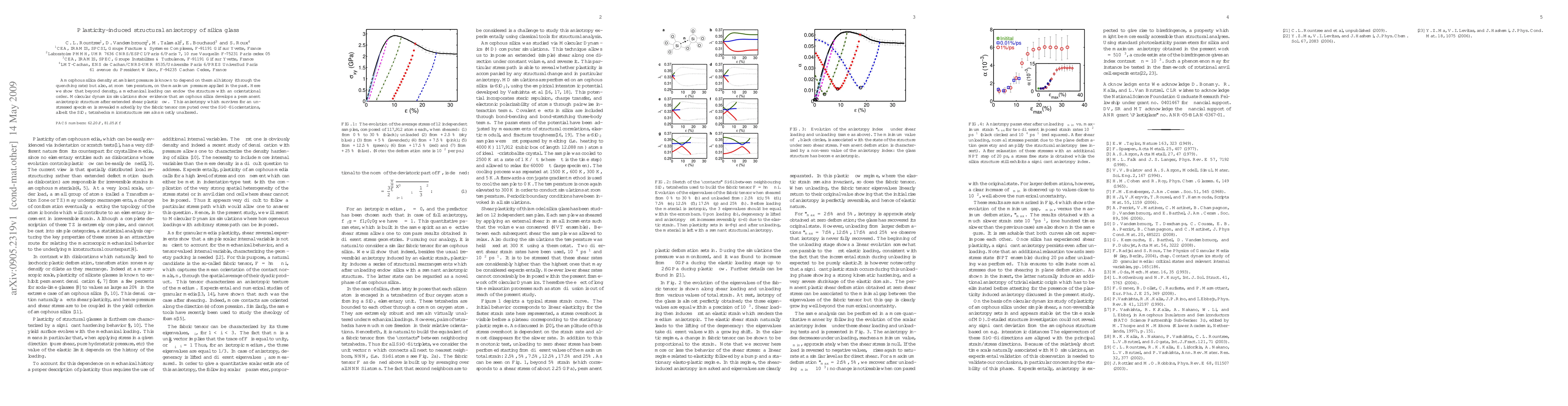 This study reveals that mechanical loading induces permanent structural anisotropy in amorphous silica beyond changes in density, with molecular dynamics simulations showing that extended shear plastic flow results in an orientational order that persists even after unloading, as evidenced by the fabric tensor. The SiO4 tetrahedra microstructure remains largely unchanged despite this anisotropy.