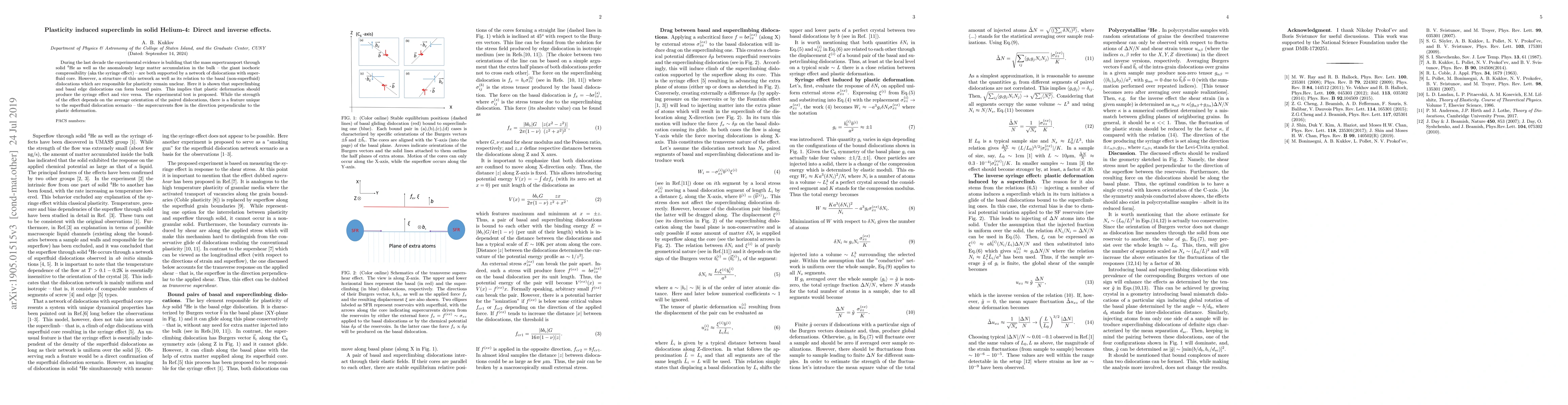 During the last decade experimental evidence is building that the mass supertransport through solid Helium-4 as well as the anomalously large matter accumulation in the bulk -- the giant isochoric compressibility (aka the syringe effect) -- are both supported by a network of dislocations with superfluid core. However, a structure of this network as well as its relation to the basal (non-superfluid) dislocations which are responsible for plasticity remain unclear. Here it is shown that superclimbing and basal edge dislocations can form bound pairs. This implies that plastic deformation should produce the syringe effect and vice versa. The experimental test is proposed. While the strength of the effect depends on the average orientation of the paired dislocations, there is a feature unique for the superfluid dislocation scenario -- the supercurrents flow in the direction perpendicular to the plastic deformation.