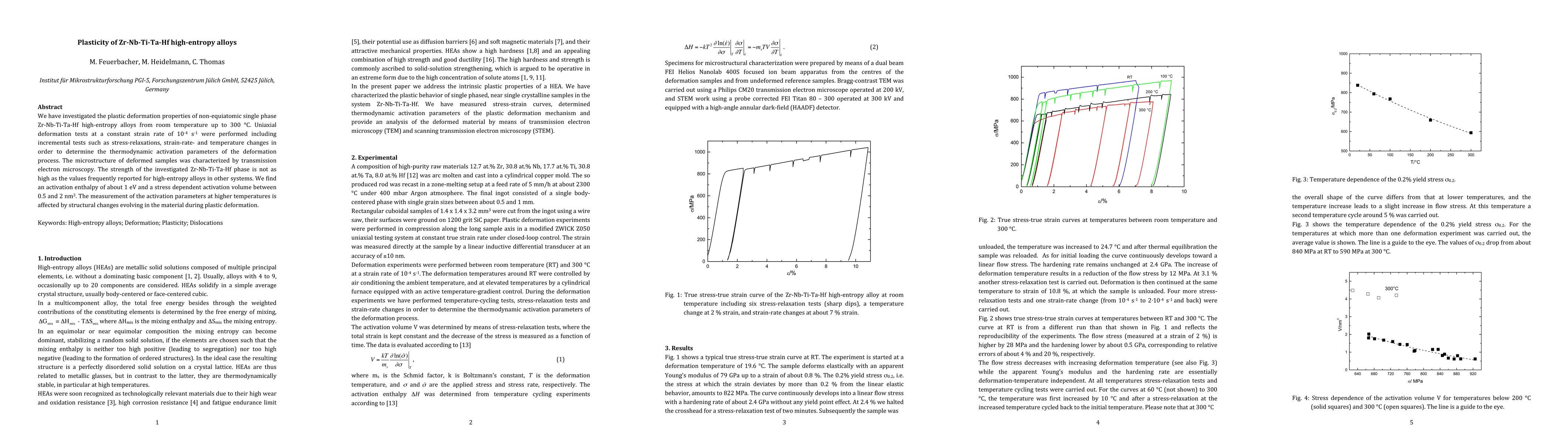 The study investigates the plastic deformation properties of non-equiatomic Zr-Nb-Ti-Ta-Hf high-entropy alloys, finding moderate strength and an activation enthalpy of around 1 eV, while structural changes complicate measurements at higher temperatures. Transmission electron microscopy characterizes the deformed microstructure.