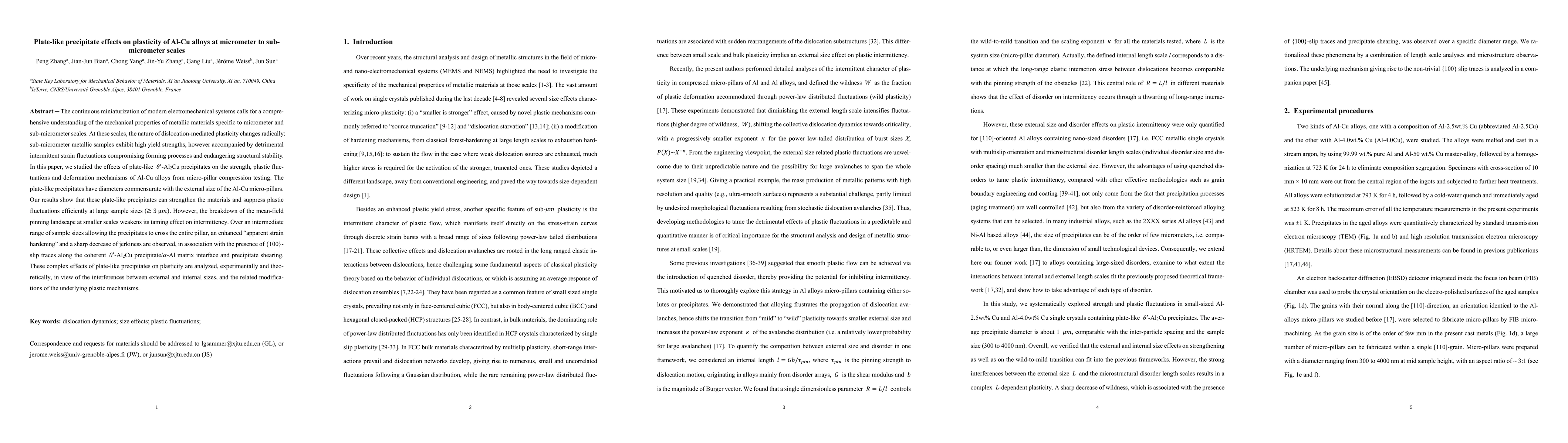 The continuous miniaturization of modern electromechanical systems calls for a comprehensive understanding of the mechanical properties of metallic materials specific to micrometer and sub-micrometer scales. At these scales, the nature of dislocation-mediated plasticity changes radically: sub-micrometer metallic samples exhibit high yield strengths, however accompanied by detrimental intermittent strain fluctuations compromising forming processes and endangering structural stability. In this paper, we studied the effects of plate-like $\theta^\prime$-Al$_2$Cu precipitates on the strength, plastic fluctuations and deformation mechanisms of Al-Cu alloys from micro-pillar compression testing. The plate-like precipitates have diameters commensurate with the external size of the Al-Cu micro-pillars. Our results show that these plate-like precipitates can strengthen the materials and suppress plastic fluctuations efficiently at large sample sizes ($\geq 3 \mu m$). However, the breakdown of the mean-field pinning landscape at smaller scales weakens its taming effect on intermittency. Over an intermediate range of sample sizes allowing the precipitates to cross the entire pillar, an enhanced apparent strain hardening and a sharp decrease of jerkiness are observed, in association with the presence of {100}-slip traces along the coherent $\theta^\prime$-Al$_2$Cu precipitate/$\alpha$-Al matrix interface and precipitate shearing. These complex effects of plate-like precipitates on plasticity are analyzed, experimentally and theoretically, in view of the interferences between external and internal sizes, and the related modifications of the underlying plastic mechanisms.