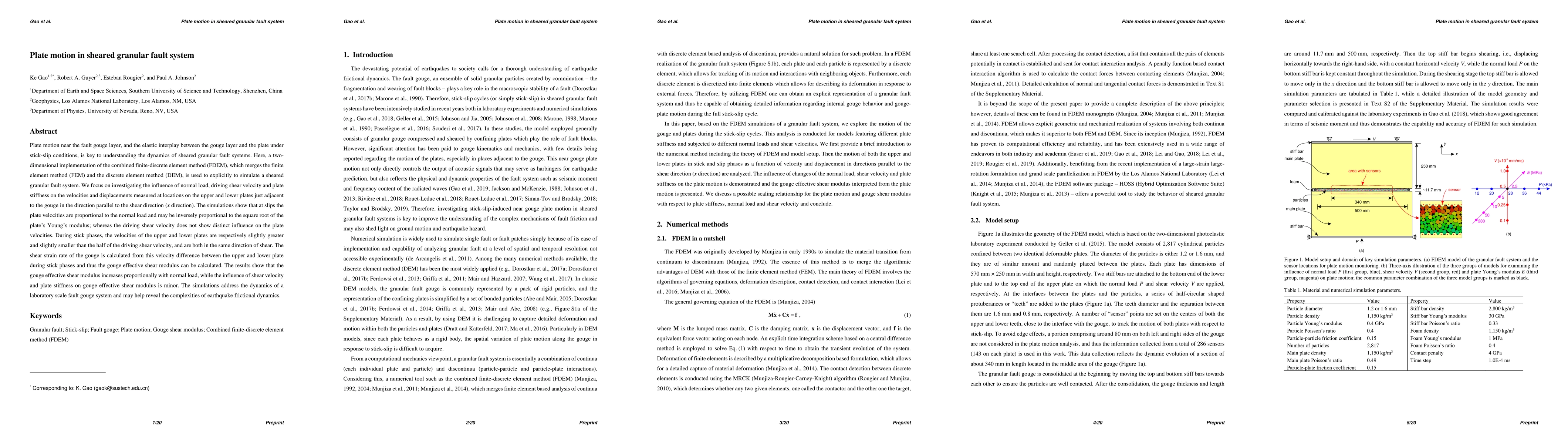 This paper uses a two-dimensional FDEM simulation to study plate motion in sheared granular fault systems, focusing on the effects of normal load, shear velocity, and plate stiffness. Results indicate that plate velocities during slips are proportional to normal load and inversely related to plate stiffness, while shear velocity has minimal influence. During stick phases, plate velocities are slightly offset from half the driving shear velocity, allowing for calculation of the gouge's effective shear modulus, which increases with normal load.