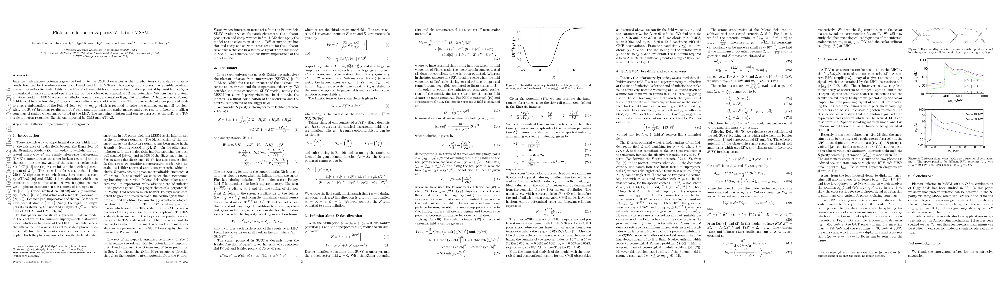 This paper constructs a plateau inflation model within the R-parity violating MSSM framework, utilizing a sneutrino-Higgs flat direction for inflation. It employs a Polonyi field for post-inflation supersymmetry breaking, stabilizing the field and addressing the cosmological moduli problem.