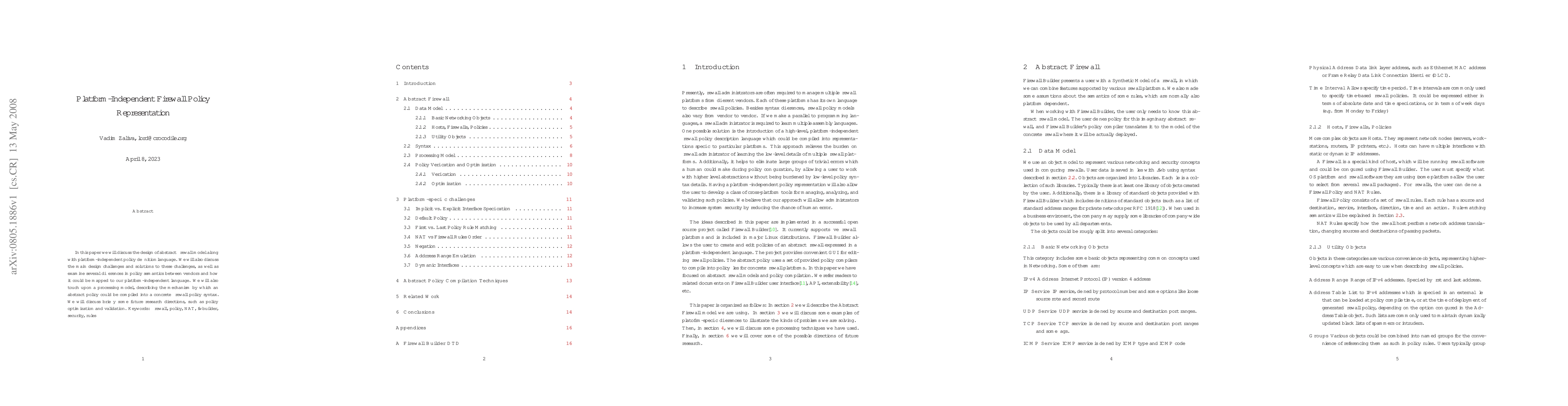 This paper designs an abstract firewall model and a platform-independent policy definition language, addressing challenges in policy semantics across vendors and proposing a compilation mechanism for abstract policies. Future research includes policy optimization and validation.