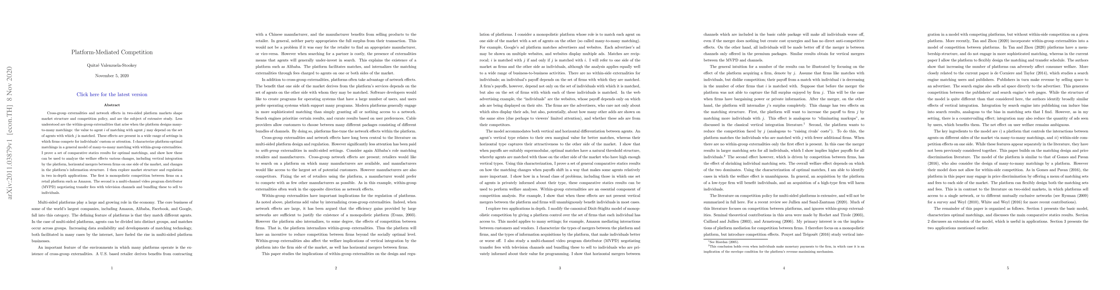 This paper explores within-group externalities in many-to-many matchings on two-sided platforms, analyzing optimal matchings under various conditions and their implications for competition policy, including vertical integration and mergers. It applies these insights to monopolistic competition on retail platforms and multi-channel video program distribution.