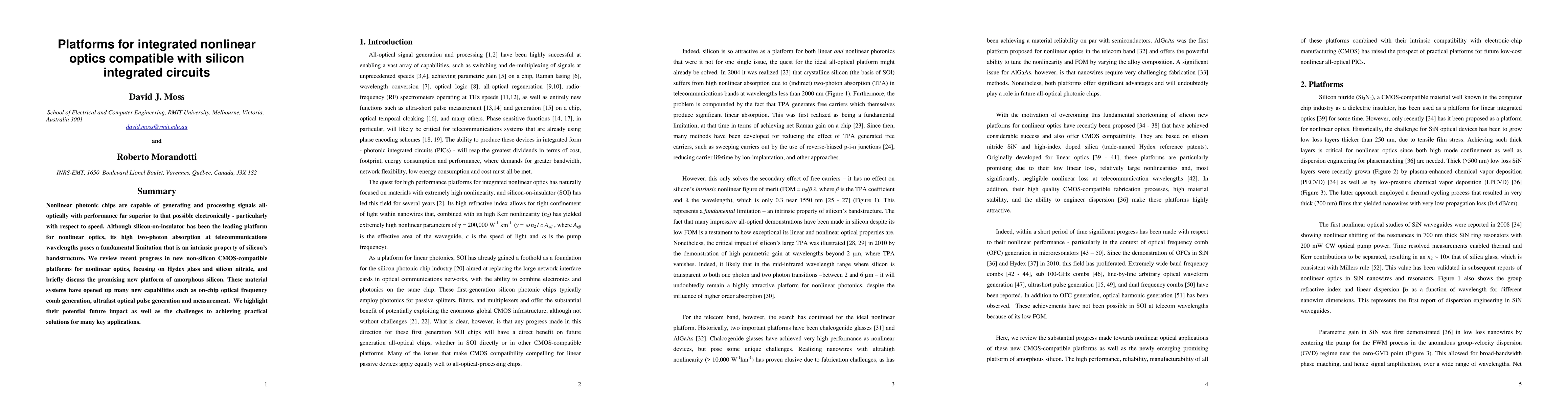 This paper reviews advancements in CMOS-compatible platforms for nonlinear optics, emphasizing Hydex glass, silicon nitride, and amorphous silicon as alternatives to silicon. These materials enable new capabilities like on-chip optical frequency comb generation, but face challenges for practical application in key technologies.