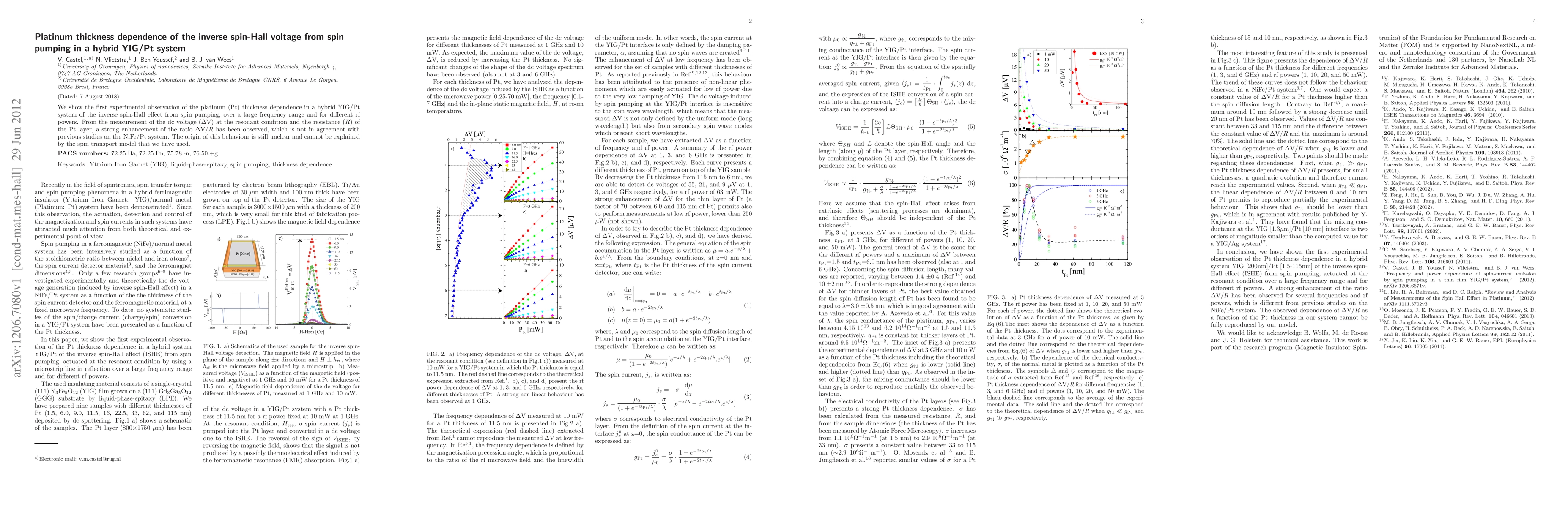 We show the first experimental observation of the platinum (Pt) thickness dependence in a hybrid YIG/Pt system of the inverse spin-Hall effect from spin pumping, over a large frequency range and for different rf powers. From the measurement of the dc voltage ($\Delta\textrm{V}$) at the resonant condition and the resistance ($R$) of the Pt layer, a strong enhancement of the ratio $\Delta\textrm{V}/R$ has been observed, which is not in agreement with previous studies on the NiFe/Pt system. The origin of this behaviour is still unclear and cannot be explained by the spin transport model that we have used.