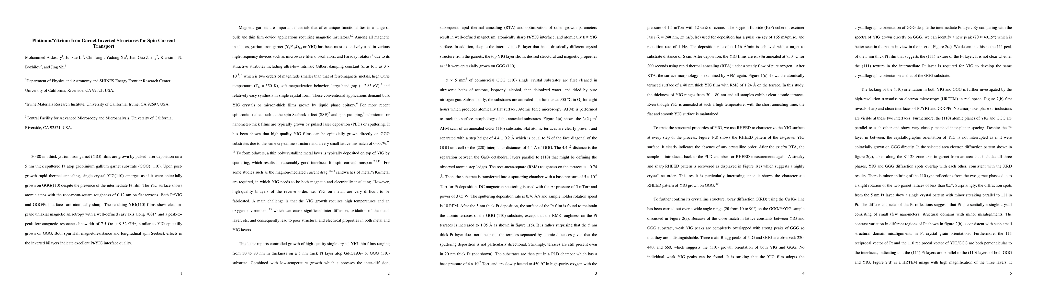 This paper investigates the growth of 30-80 nm thick YIG films on Pt/GGG substrates via pulsed laser deposition, revealing atomically sharp Pt/YIG interfaces and excellent spin current transport properties, evidenced by strong spin Hall magnetoresistance and longitudinal spin Seebeck effects.