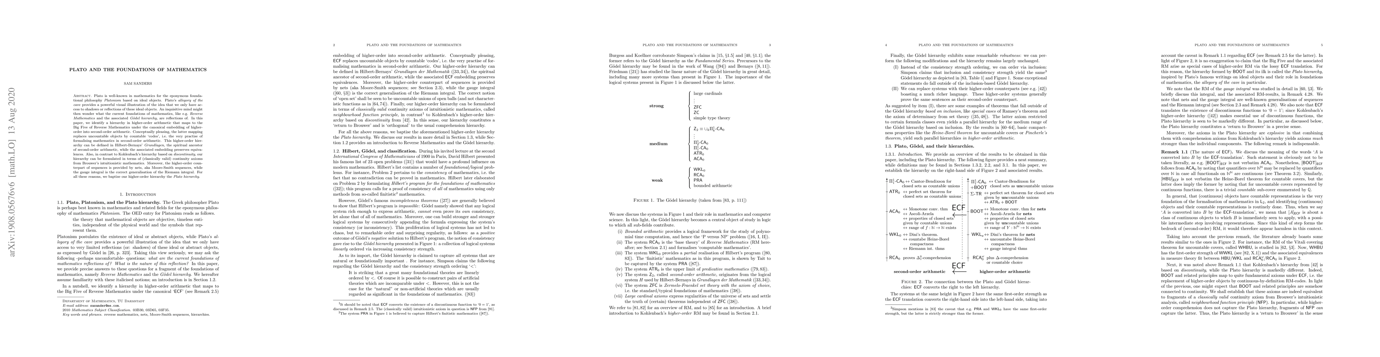 Plato is well-known in mathematics for the eponymous foundational philosophy Platonism based on ideal objects. Plato's allegory of the cave provides a powerful visual illustration of the idea that we only have access to shadows or reflections of these ideal objects. An inquisitive mind might then wonder what the current foundations of mathematics, like e.g. Reverse Mathematics and the associated Goedel hierarchy, are reflections of. In this paper, we identify a hierarchy in higher-order arithmetic that maps to the Big Five of Reverse Mathematics under the canonical embedding of higher-order into second-order arithmetic. Conceptually pleasing, the latter mapping replaces uncountable objects by countable 'codes', i.e. the very practise of formalising mathematics in second-order arithmetic. This higher-order hierarchy can be defined in Hilbert-Bernays' Grundlagen, the spiritual ancestor of second-order arithmetic, while the associated embedding preserves equivalences. Also, in contrast to Kohlenbach's hierarchy based on discontinuity, our hierarchy can be formulated in terms of (classically valid) continuity axioms from Brouwer's intuitionistic mathematics. Moreover, the higher-order counterpart of sequences is provided by nets, aka Moore-Smith sequences, while the gauge integral is the correct generalisation of the Riemann integral. For all these reasons, we baptise our higher-order hierarchy the Plato hierarchy.