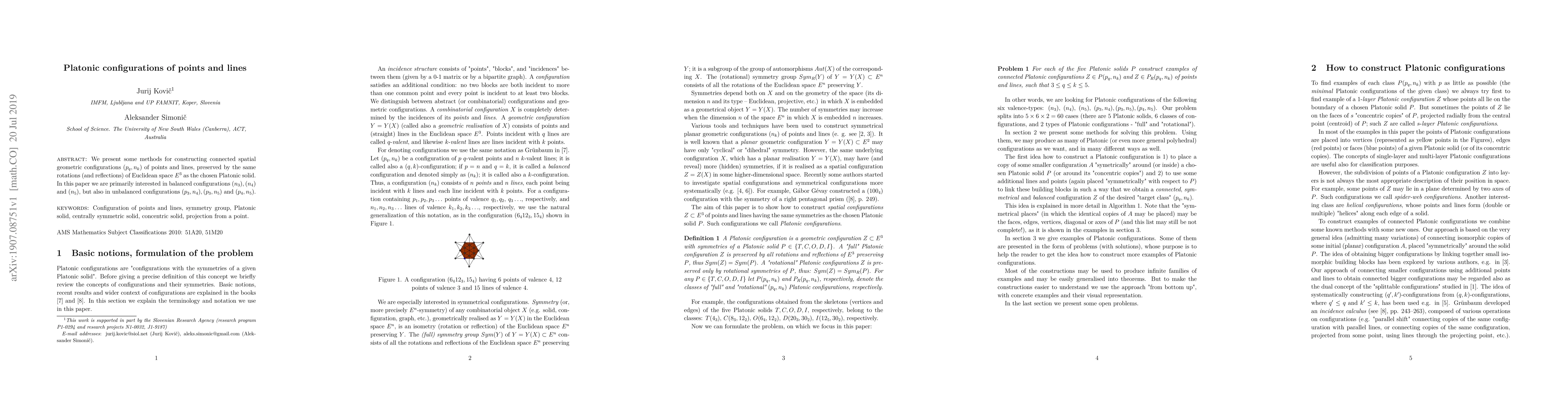 The paper presents methods for constructing connected spatial geometric configurations (p_q, n_k) of points and lines, preserved by the same rotations (and reflections) of Euclidean space E^3 as the chosen Platonic solid, focusing on balanced and unbalanced configurations.