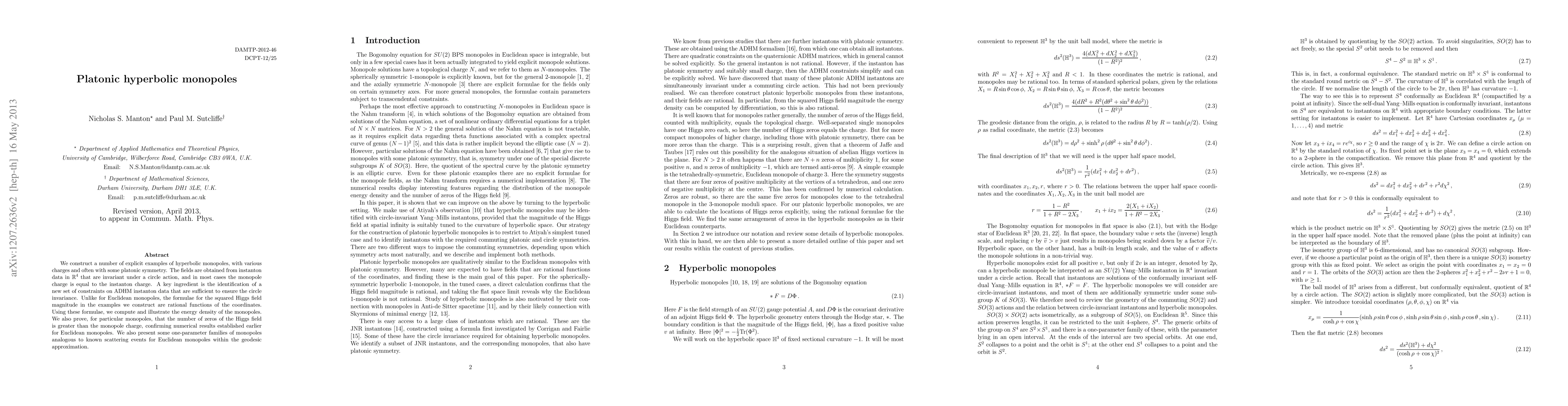 This paper constructs explicit examples of hyperbolic monopoles with various charges and platonic symmetry, derived from instanton data invariant under a circle action. It identifies new constraints on ADHM instanton data to ensure circle invariance, and computes the energy density of these monopoles, confirming that the number of Higgs field zeros exceeds the monopole charge.