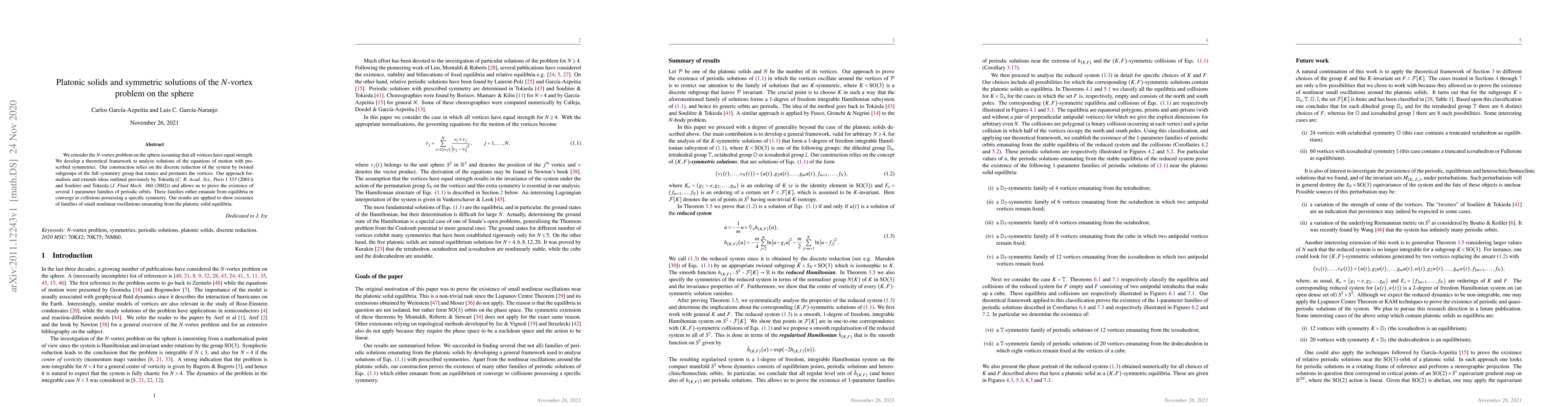 This paper explores symmetric solutions to the $N$-vortex problem on a sphere, focusing on vortices of equal strength. It develops a theoretical framework based on discrete reduction and symmetry groups, proving the existence of periodic orbits and small oscillations emanating from platonic solid equilibria.