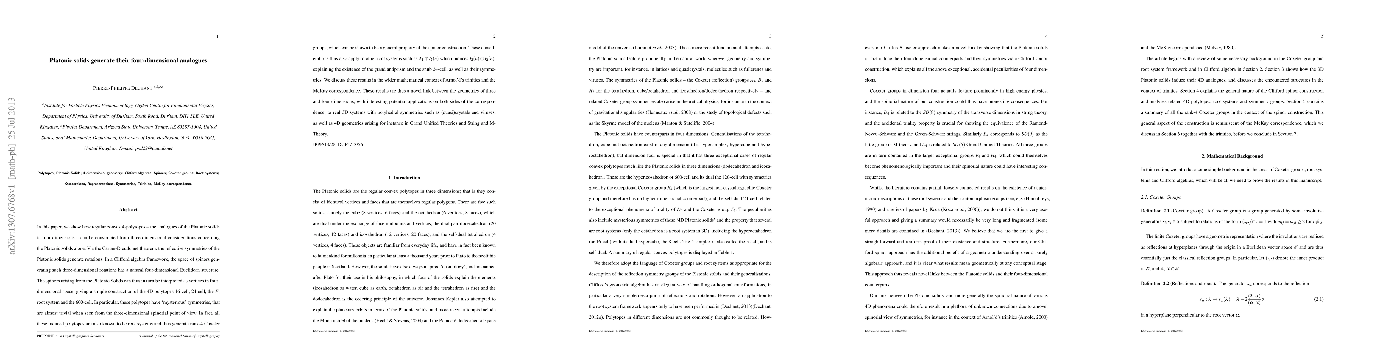 This paper demonstrates a method to construct four-dimensional regular convex polytopes (analogues of Platonic solids) using three-dimensional considerations of Platonic solids, leveraging the Cartan-Dieudonne theorem and Clifford algebra to reveal their symmetries and root system properties. The approach links 3D and 4D geometries with potential implications for (quasi)crystals and theoretical physics.