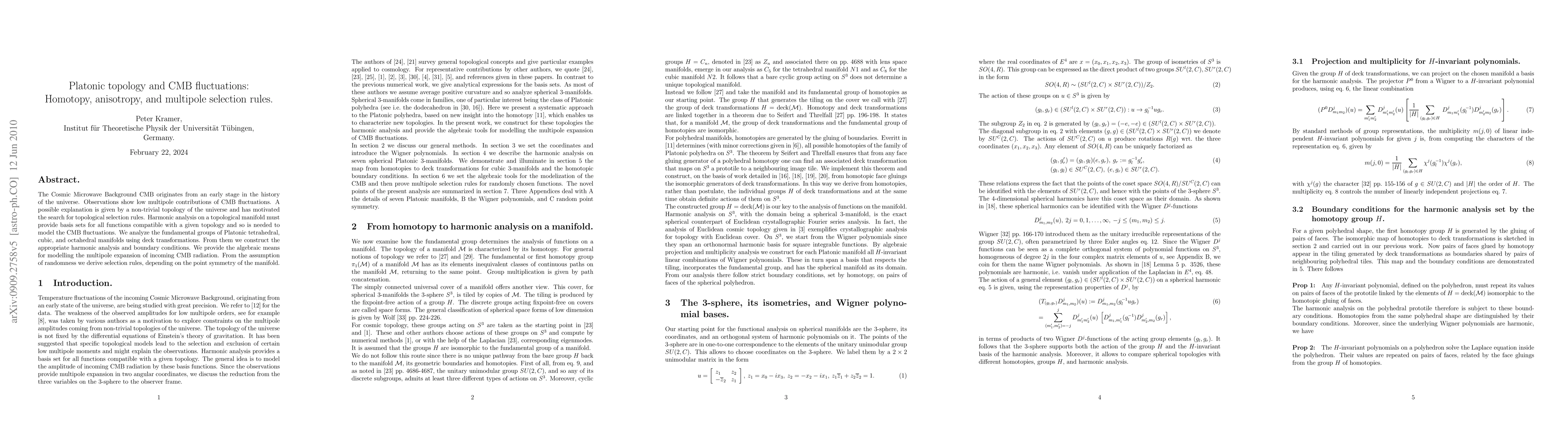 This research explores how Platonic topology influences Cosmic Microwave Background (CMB) fluctuations, deriving selection rules based on the homotopy of spherical 3-manifolds. It constructs invariant combinations of Wigner polynomials for specific Platonic solids and uses algebraic methods to establish multipole selection rules tied to the manifolds' point symmetries.