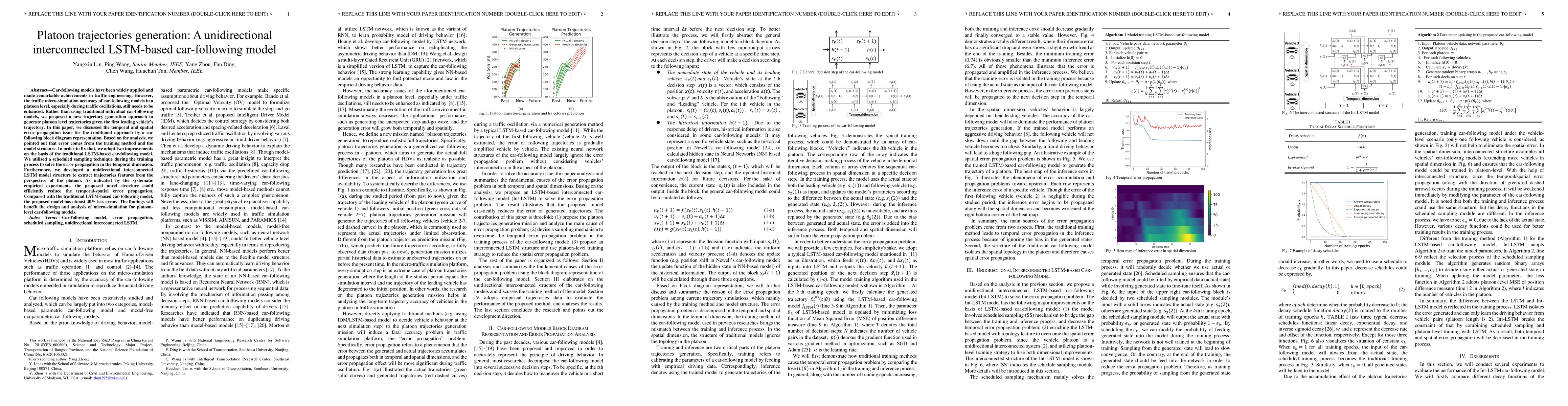 This paper proposes a unidirectional interconnected LSTM-based car following model to generate platoon-level trajectories, addressing temporal and spatial error propagation issues in traditional models. The new model, enhanced by scheduled sampling and a novel LSTM structure, reduces errors by nearly 40% compared to traditional methods.
