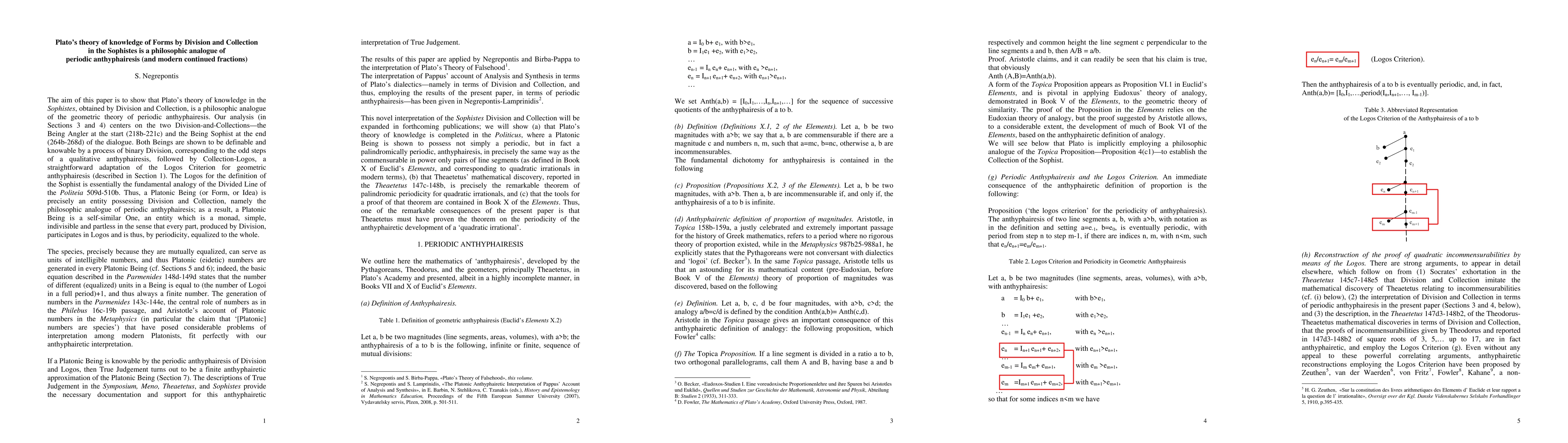 The aim of this paper is to show that Plato's theory of knowledge of Forms (intelligible Beings, Ideas) in the Sophistes, obtained by Division and Collection, is a close philosophic analogue of the geometric theory of periodic anthyphairesis, an ancient theory of incommensurability (developed by the Pythagoreans, Theodorus and Theaetetus) having its modern counterpart in the theory of continued fractions. Division corresponds to infinite anthyphairetic division, Collection to the Logos Criterion, resulting in periodicity and a self-similar One, precisely the One of a Platonic Form.