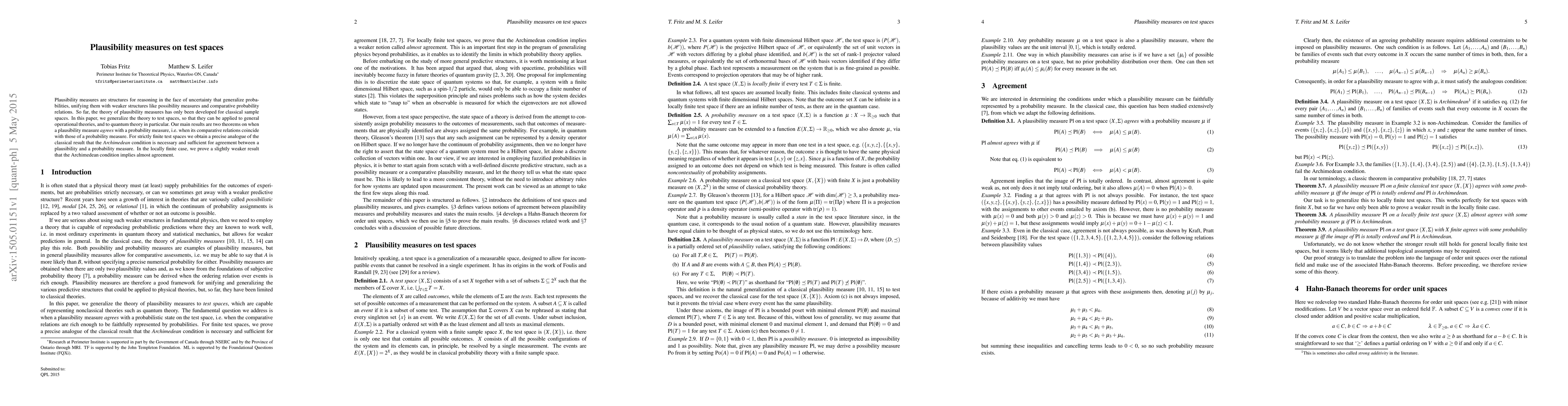The paper introduces a framework for plausibility measures on test spaces, extending classical results to locally finite test spaces using Hahn-Banach theorems for order unit spaces.