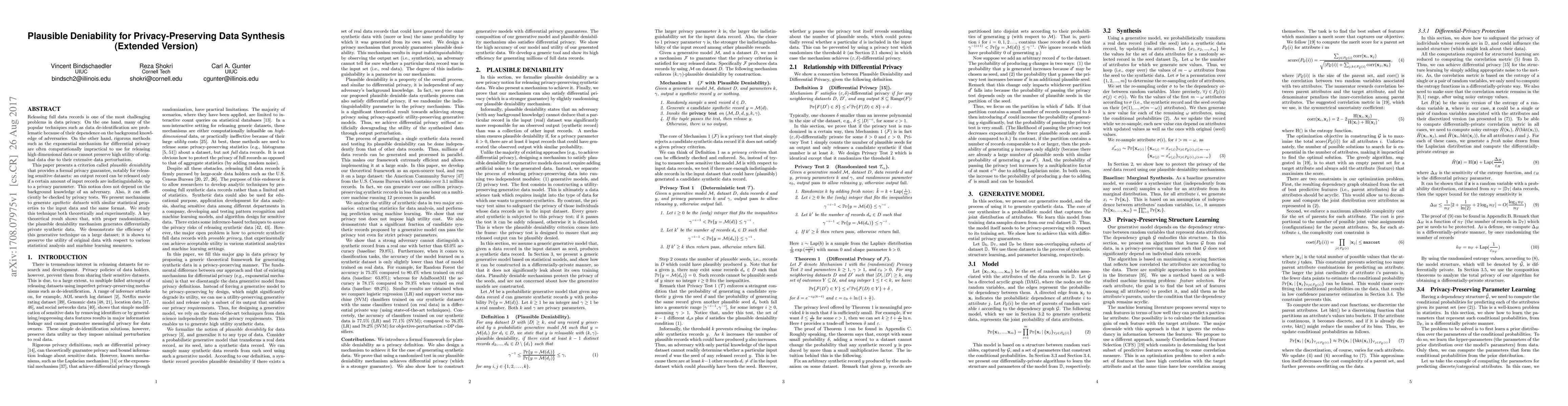 This paper introduces a plausible deniability criterion for privacy-preserving data synthesis, offering a formal privacy guarantee that does not rely on adversary background knowledge. It presents mechanisms for generating synthetic datasets that maintain statistical properties and utility, demonstrating efficiency and differential privacy through theoretical and experimental validation.
