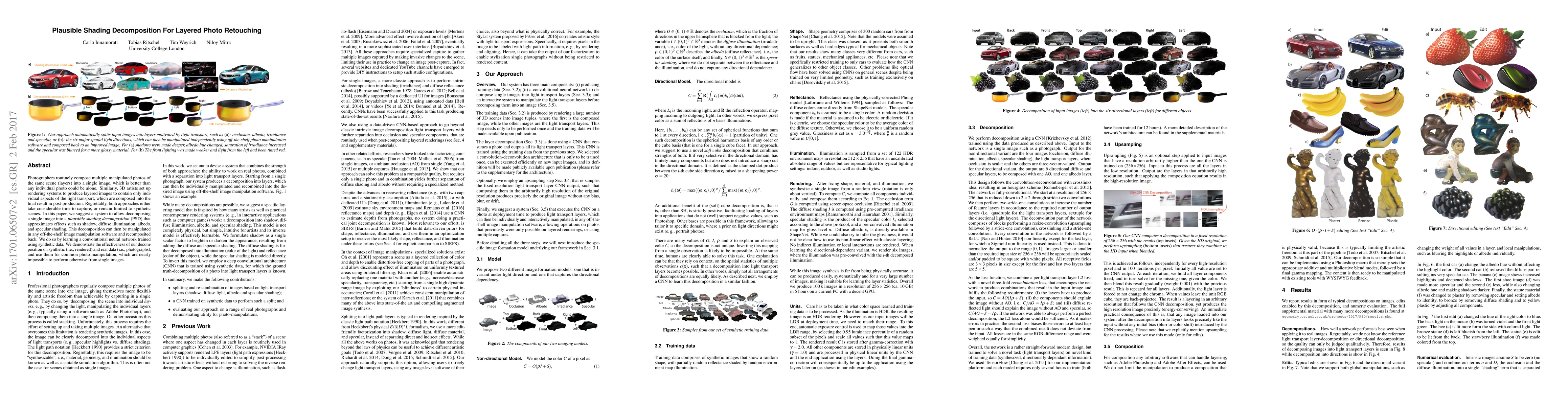 This paper proposes a system for decomposing a single image into plausible shading components like shadow, diffuse, albedo, and specular effects using a convolutional neural network trained on synthetic data. The decomposed layers can be manipulated and recombined, enabling advanced photo retouching that would be difficult from single images.