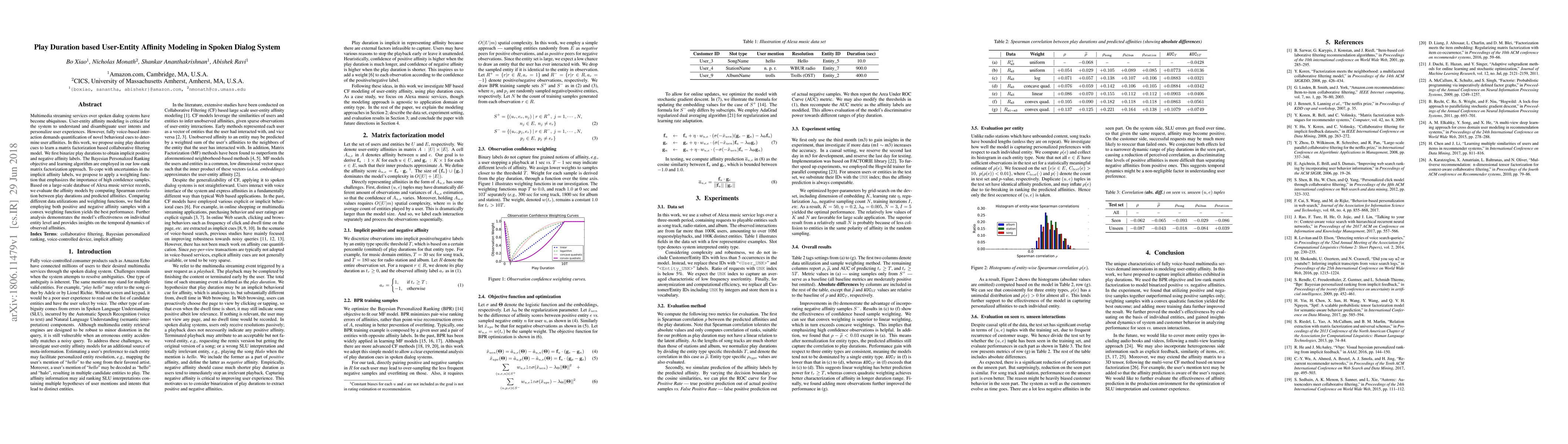 Researchers propose using play duration cues to model user-entity affinity in spoken dialog systems, achieving better performance when combining positive and negative affinity samples with a convex weighting function.