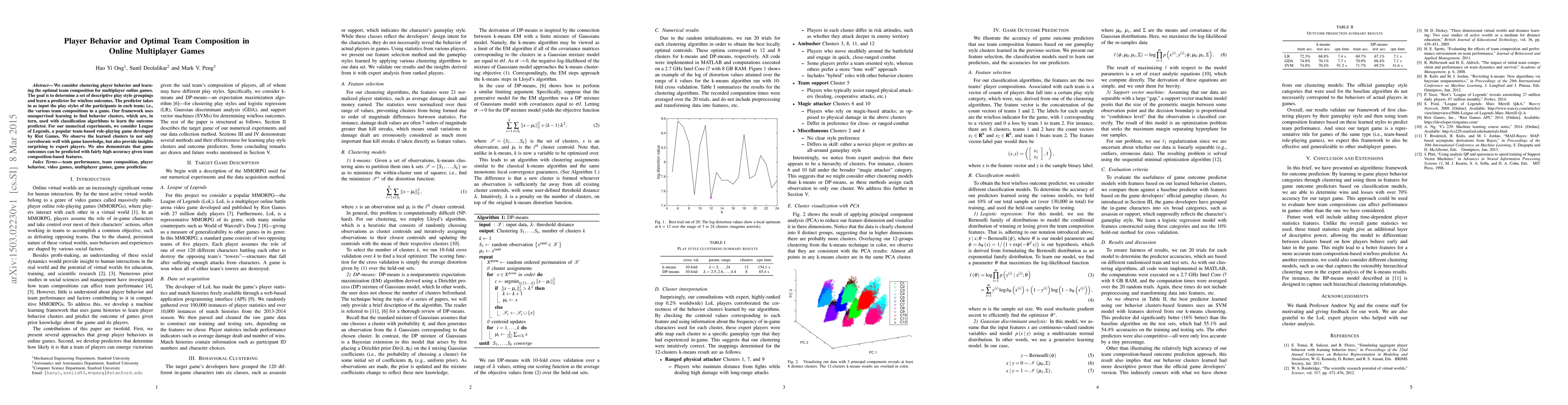 We consider clustering player behavior and learning the optimal team composition for multiplayer online games. The goal is to determine a set of descriptive play style groupings and learn a predictor for win/loss outcomes. The predictor takes in as input the play styles of the participants in each team; i.e., the various team compositions in a game. Our framework uses unsupervised learning to find behavior clusters, which are, in turn, used with classification algorithms to learn the outcome predictor. For our numerical experiments, we consider League of Legends, a popular team-based role-playing game developed by Riot Games. We observe the learned clusters to not only corroborate well with game knowledge, but also provide insights surprising to expert players. We also demonstrate that game outcomes can be predicted with fairly high accuracy given team composition-based features.