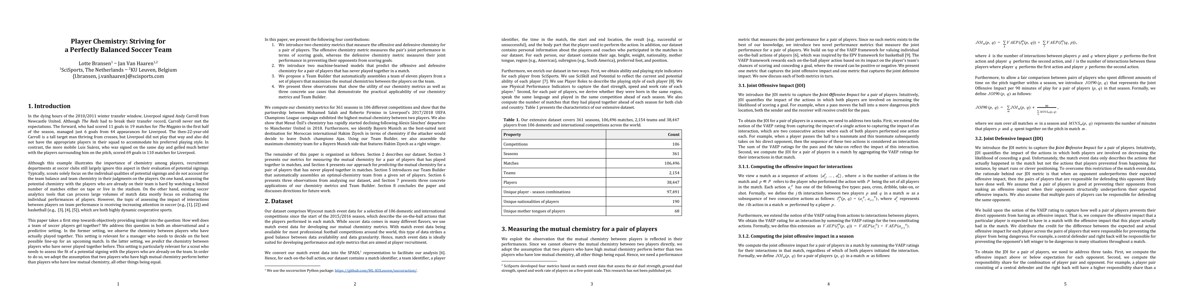 Soccer scouts typically ignore the team balance and team chemistry when evaluating potential signings for their teams. Instead, they focus on the individual qualities of the players in isolation. To overcome this limitation of their recruitment process, this paper takes a first step towards objectively providing insight into the question: How well does a team of soccer players gel? We address that question in both an observational and a predictive setting. In the former setting, we observe the chemistry between players who have actually played together, which is relevant when selecting the best possible line-up for a match. In the latter setting, we predict the chemistry between players who have never played together before, which is particularly relevant to assess the fit of a potential signing with the players who are already on the team. We introduce two chemistry metrics that measure the offensive and defensive chemistry for a pair of players, respectively. The offensive chemistry metric measures the pair's joint performance in terms of scoring goals, whereas the defensive chemistry metric measures their joint performance in preventing their opponents from scoring goals. We compute our metrics for 361 seasons in 106 different competitions and present a number of concrete use cases. For instance, we show that the partnership between Mohamed Salah and Roberto Firmino in Liverpool's 2017/2018 Champions League campaign exhibited the highest mutual chemistry between two players. Furthermore, we show that Mesut \"Ozil's chemistry has rapidly started declining following Alexis S\'anchez' departure to Manchester United in 2018.