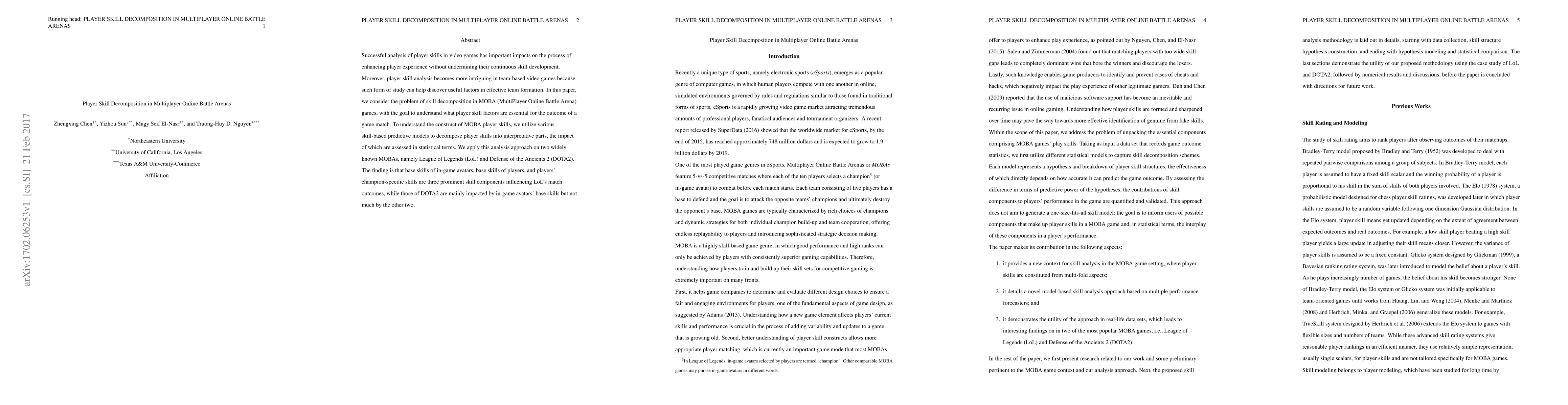This paper decomposes player skills in MOBA games to identify key factors influencing match outcomes. It finds that in League of Legends, base skills of avatars, player base skills, and champion-specific skills are crucial, whereas in DOTA2, only avatar base skills significantly impact results.