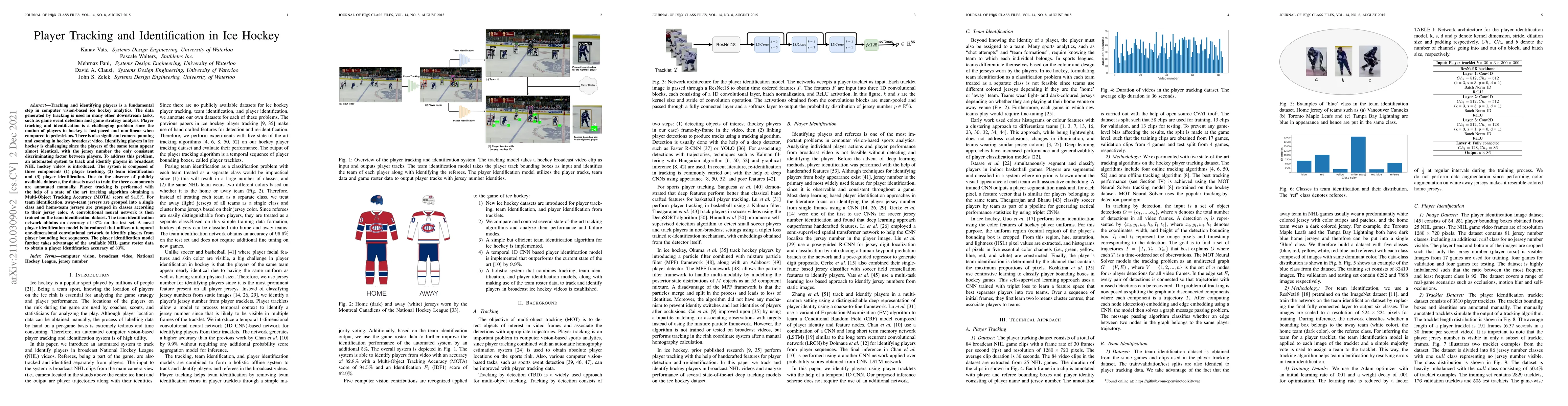 This paper presents an automated system for tracking and identifying players in NHL hockey videos, composed of player tracking, team identification, and player identification components. The system achieves high accuracy in player tracking (94.5% MOTA), team identification (97%), and player identification (83%) using advanced algorithms and manually annotated datasets.