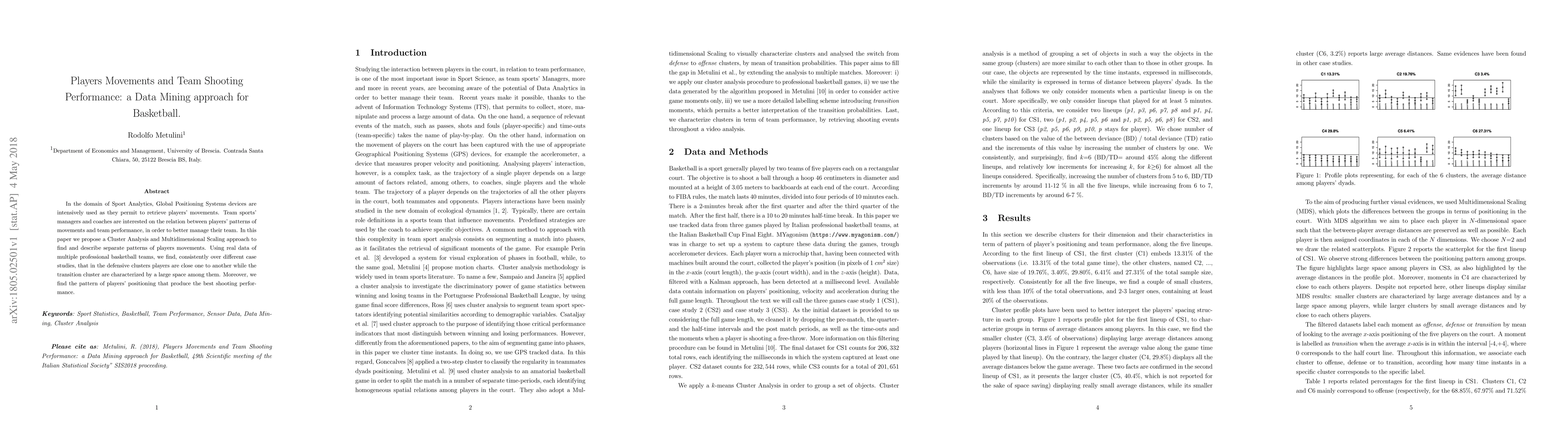 In the domain of Sport Analytics, Global Positioning Systems devices are intensively used as they permit to retrieve players' movements. Team sports' managers and coaches are interested on the relation between players' patterns of movements and team performance, in order to better manage their team. In this paper we propose a Cluster Analysis and Multidimensional Scaling approach to find and describe separate patterns of players movements. Using real data of multiple professional basketball teams, we find, consistently over different case studies, that in the defensive clusters players are close one to another while the transition cluster are characterized by a large space among them. Moreover, we find the pattern of players' positioning that produce the best shooting performance.