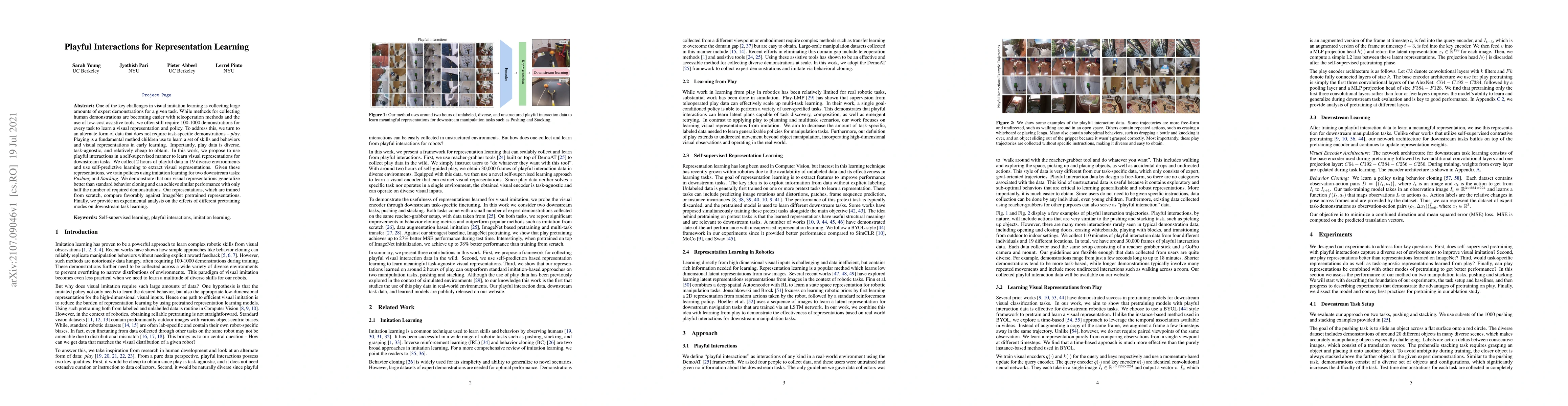 This paper proposes using playful interactions in self-supervised learning to develop visual representations for imitation learning tasks, requiring fewer demonstrations than traditional methods. The approach shows improved generalization and comparable performance with half the number of demonstrations, outperforming ImageNet pretrained representations.