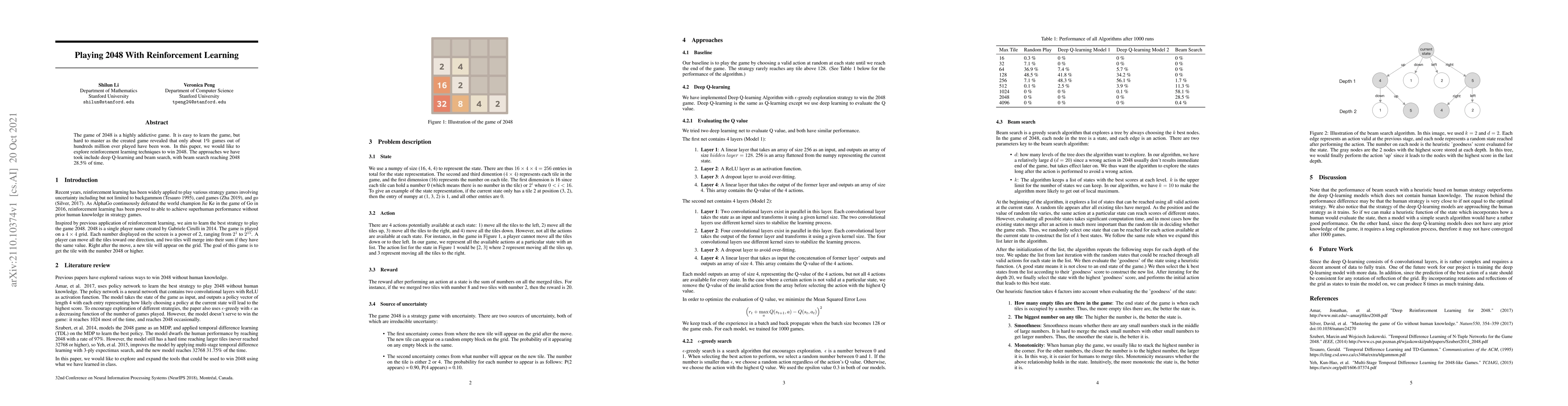 The game of 2048 is a highly addictive game. It is easy to learn the game, but hard to master as the created game revealed that only about 1% games out of hundreds million ever played have been won. In this paper, we would like to explore reinforcement learning techniques to win 2048. The approaches we have took include deep Q-learning and beam search, with beam search reaching 2048 28.5 of time.