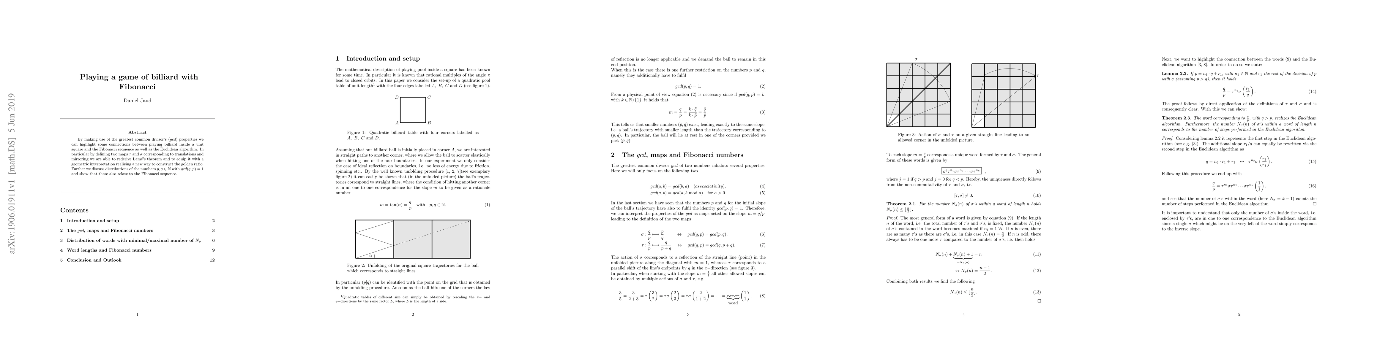 By making use of the greatest common divisor's ($gcd$) properties we can highlight some connections between playing billiard inside a unit square and the Fibonacci sequence as well as the Euclidean algorithm. In particular by defining two maps $\tau$ and $\sigma$ corresponding to translations and mirroring we are able to rederive Lam\'{e}'s theorem and to equip it with a geometric interpretation realizing a new way to construct the golden ratio. Further we discuss distributions of the numbers $p,q\in \mathbb{N}$ with $gcd(q,p)=1$ and show that these also relate to the Fibonacci sequence.